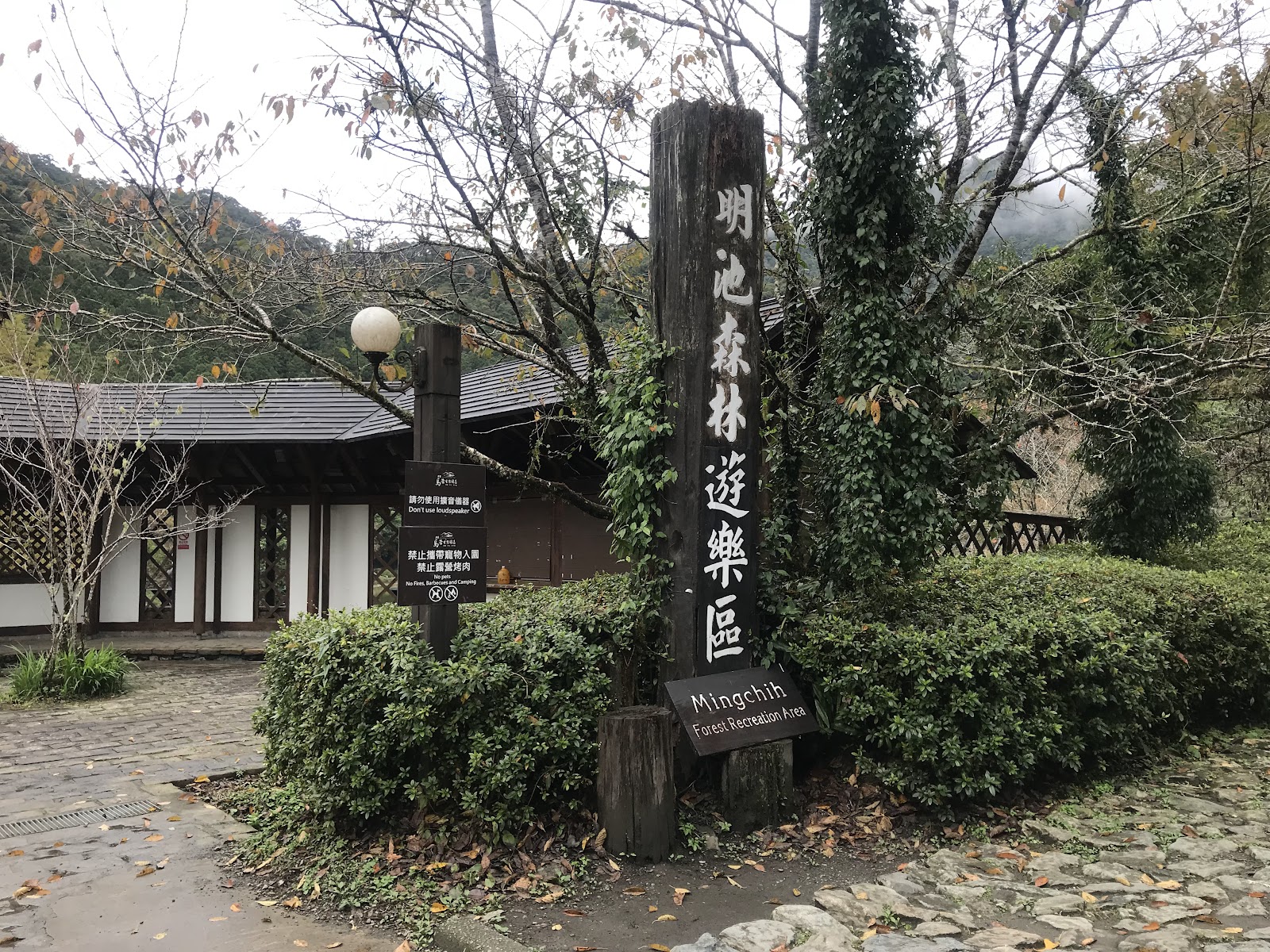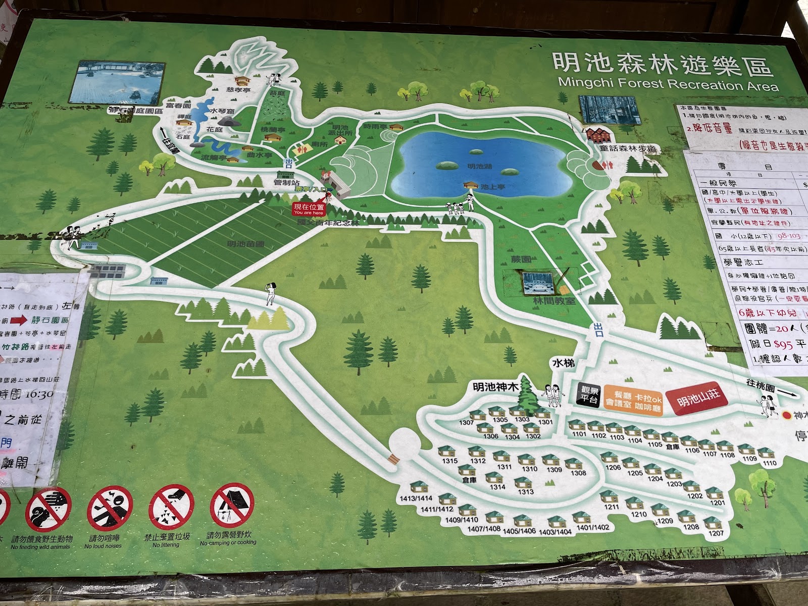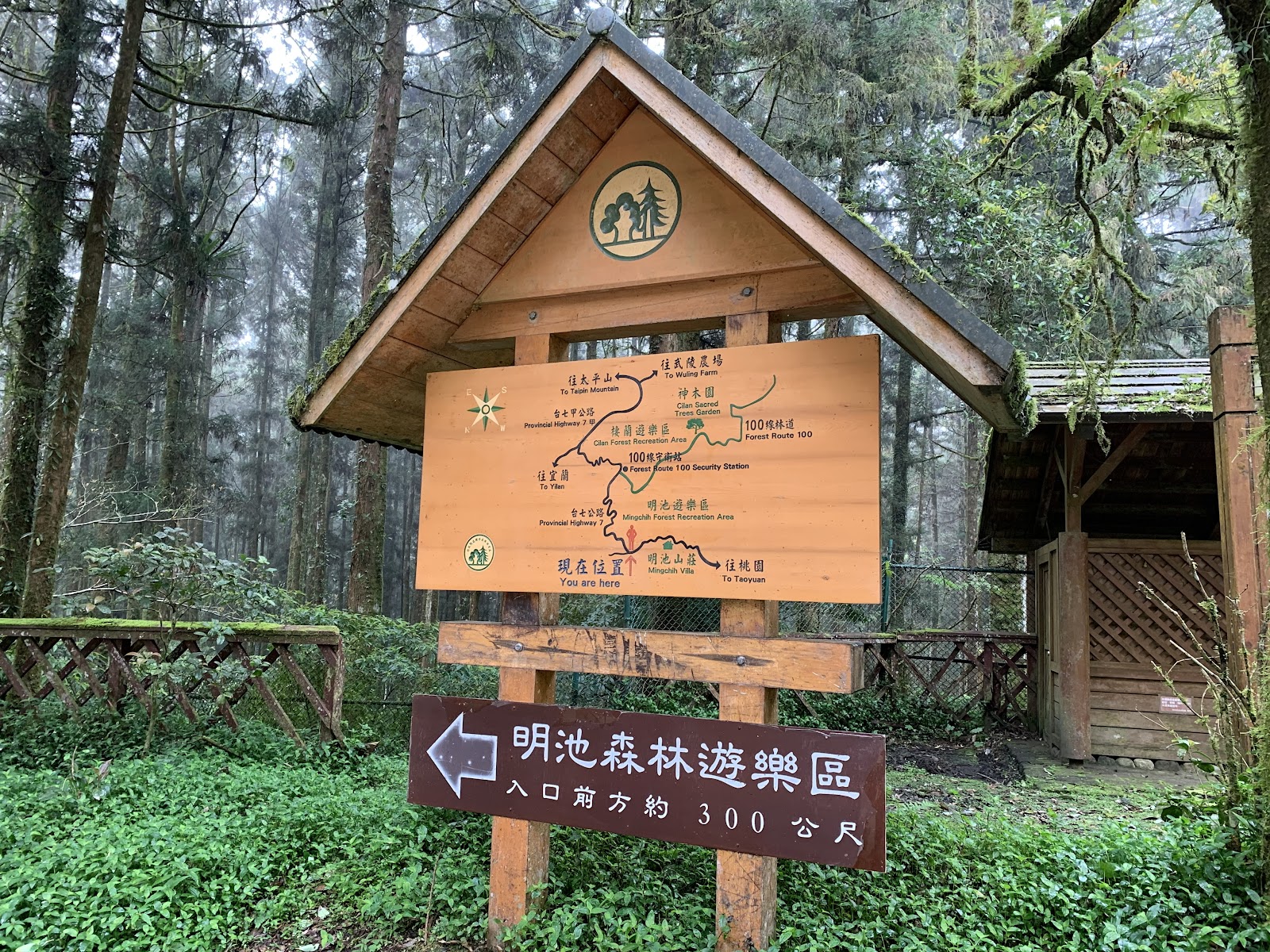 停車場有點貴,一次100元,位於明池山莊旁,步行約8分鐘可以到園區,門口有售票亭,價格我覺得以這類森林公園來說稍高,可能因為他是外包的。