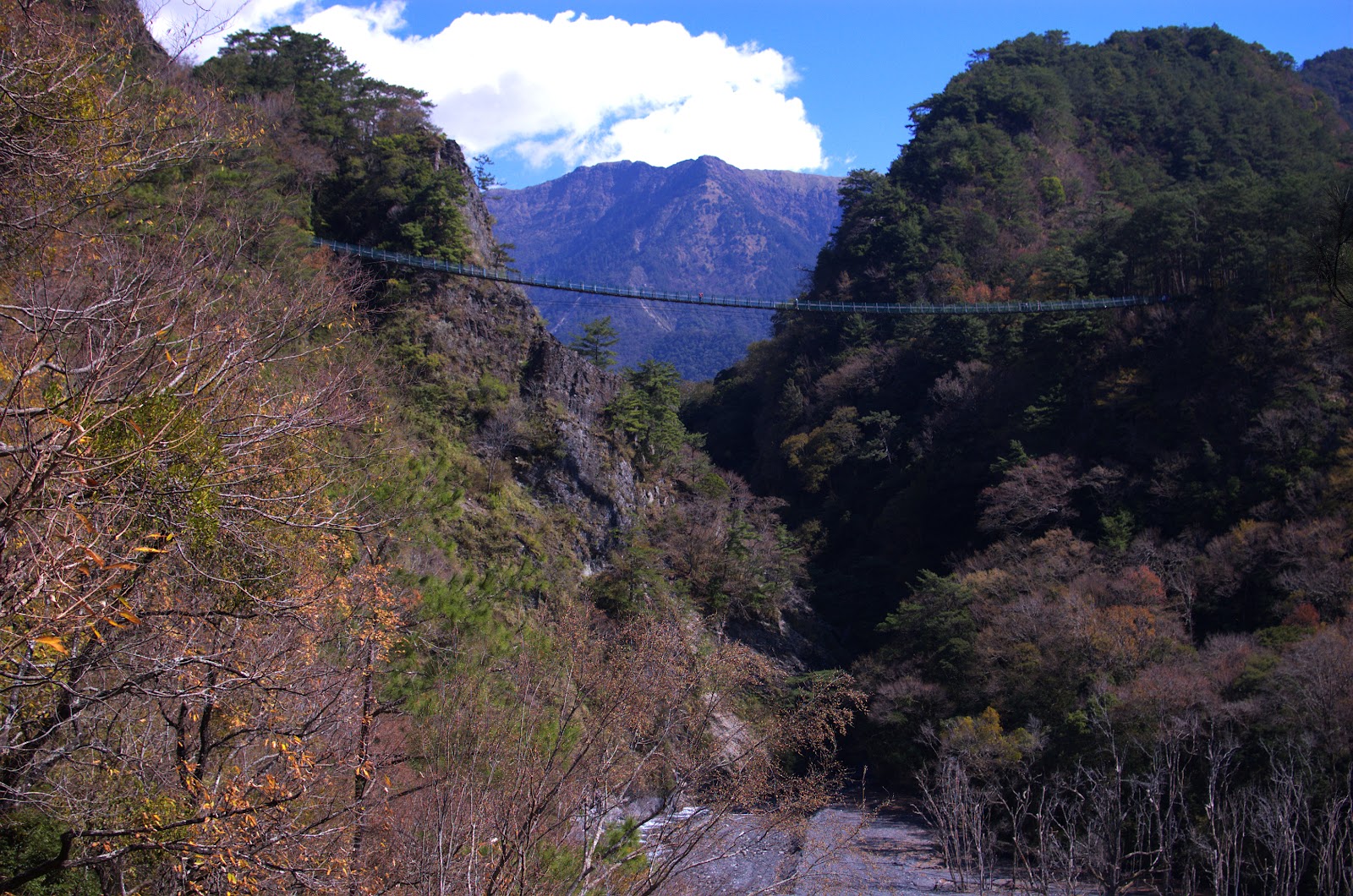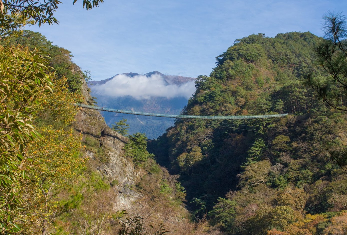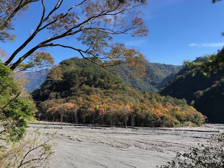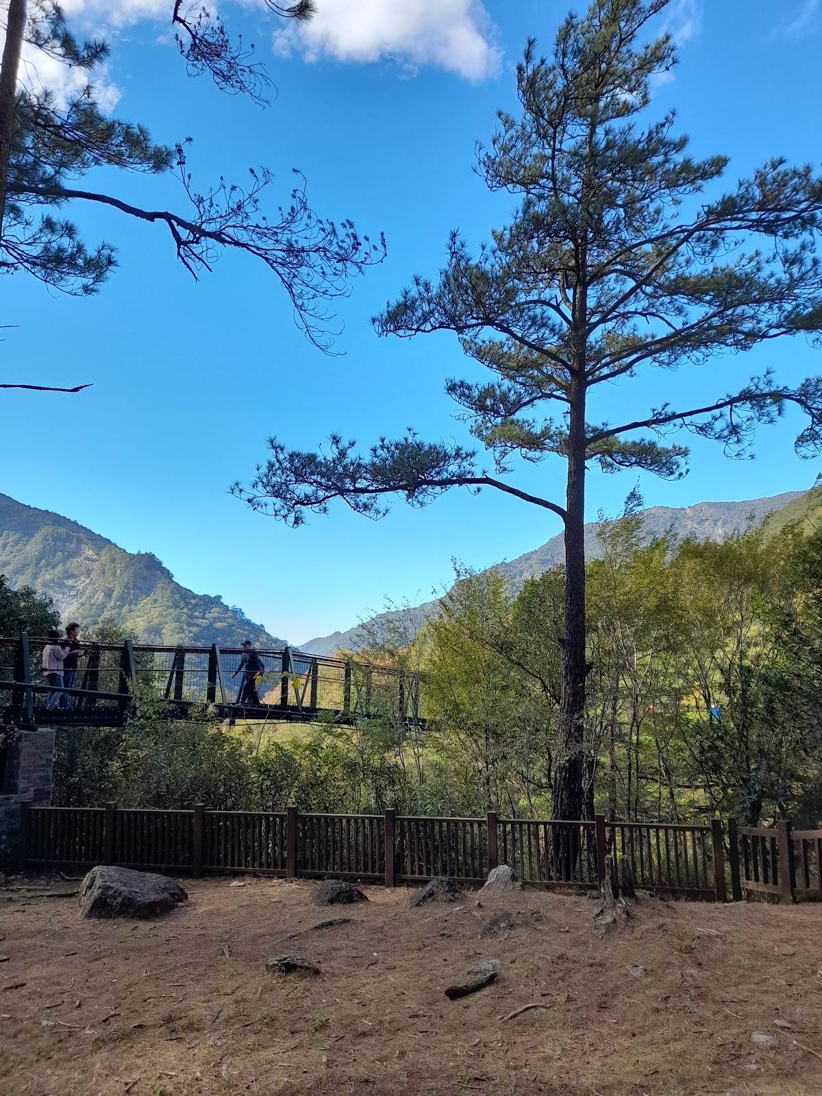 吊橋長180公尺、高90公尺,是必去之觀賞景點,可俯瞰萬大溪谷,林區空氣清新使人心曠神怡,楓林尚未火紅,瀑布暫停開放