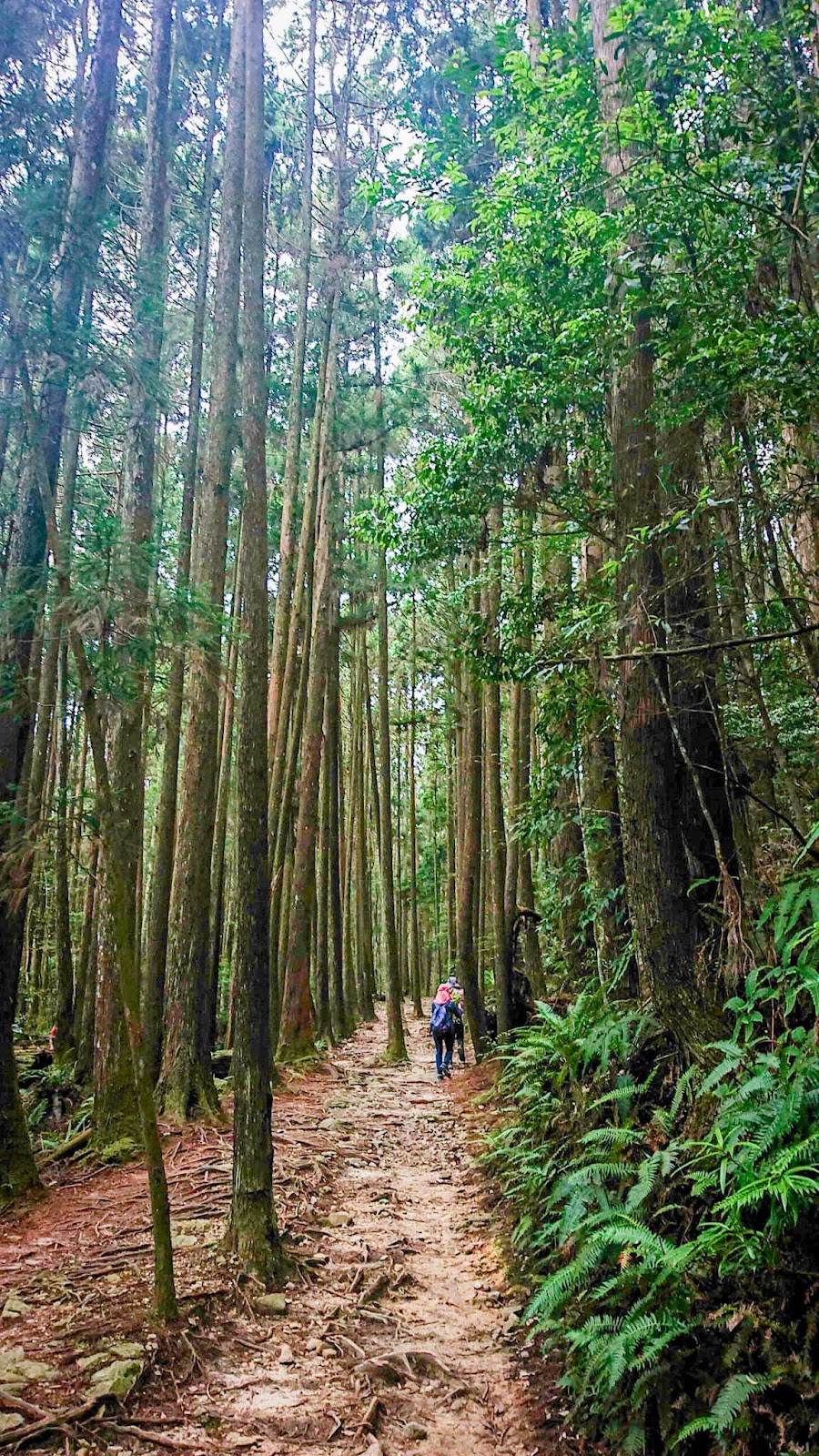 ✫特色:杉林筆直濃密不曬,夏天涼爽舒適,路徑為石頭+落葉+樹根盤繞,偶有起霧仙氣飄飄挺美,後半攀爬需要一點腳力拉繩建議戴手套