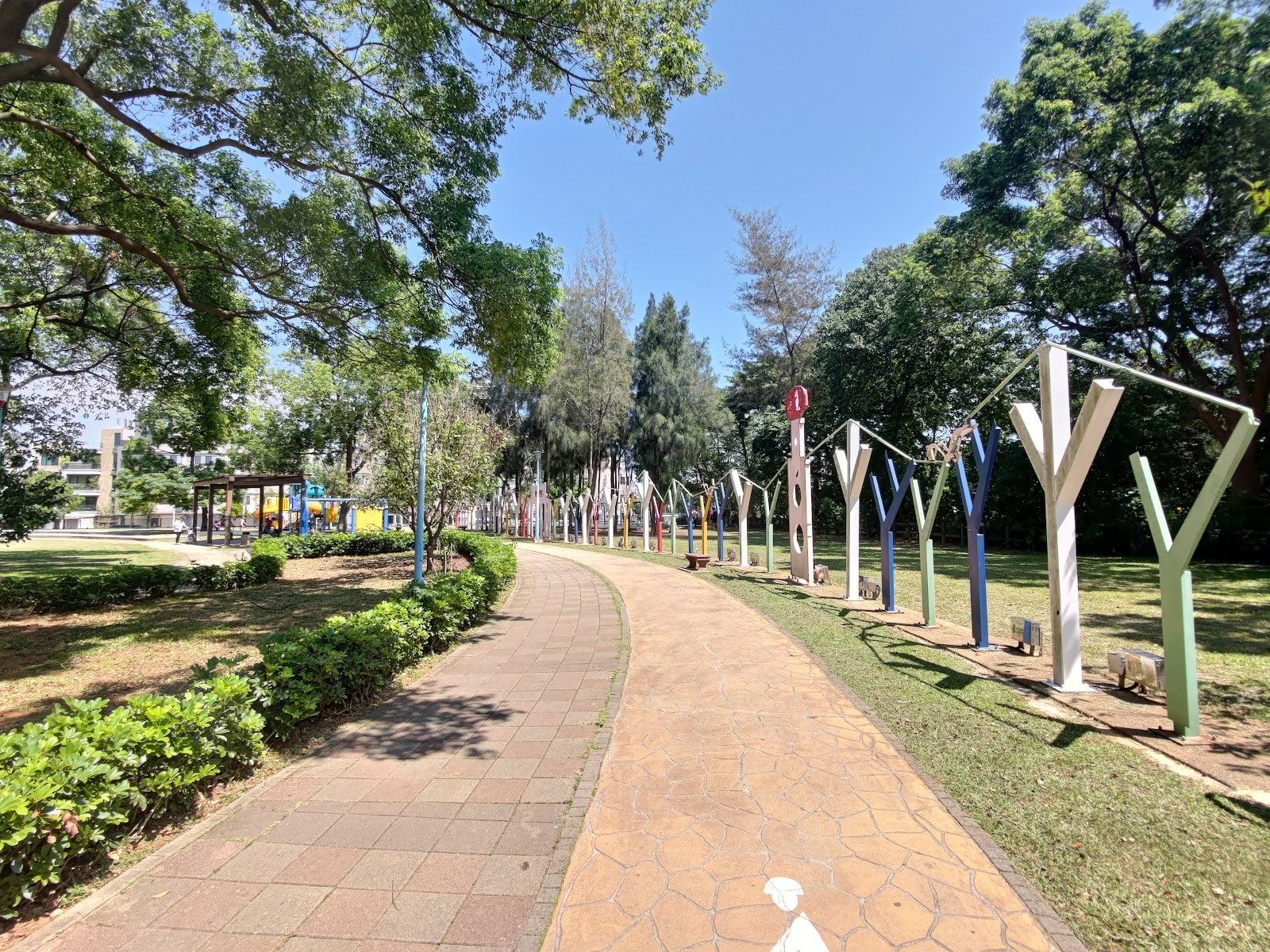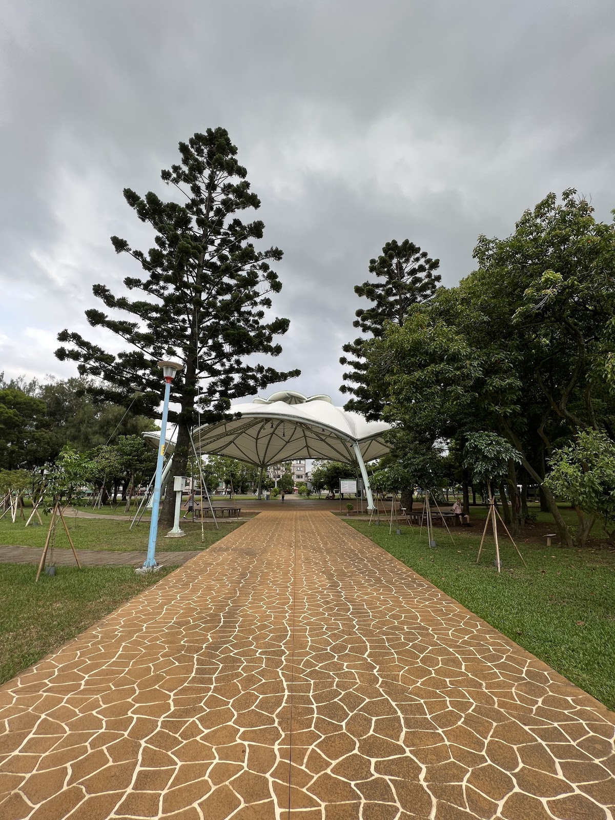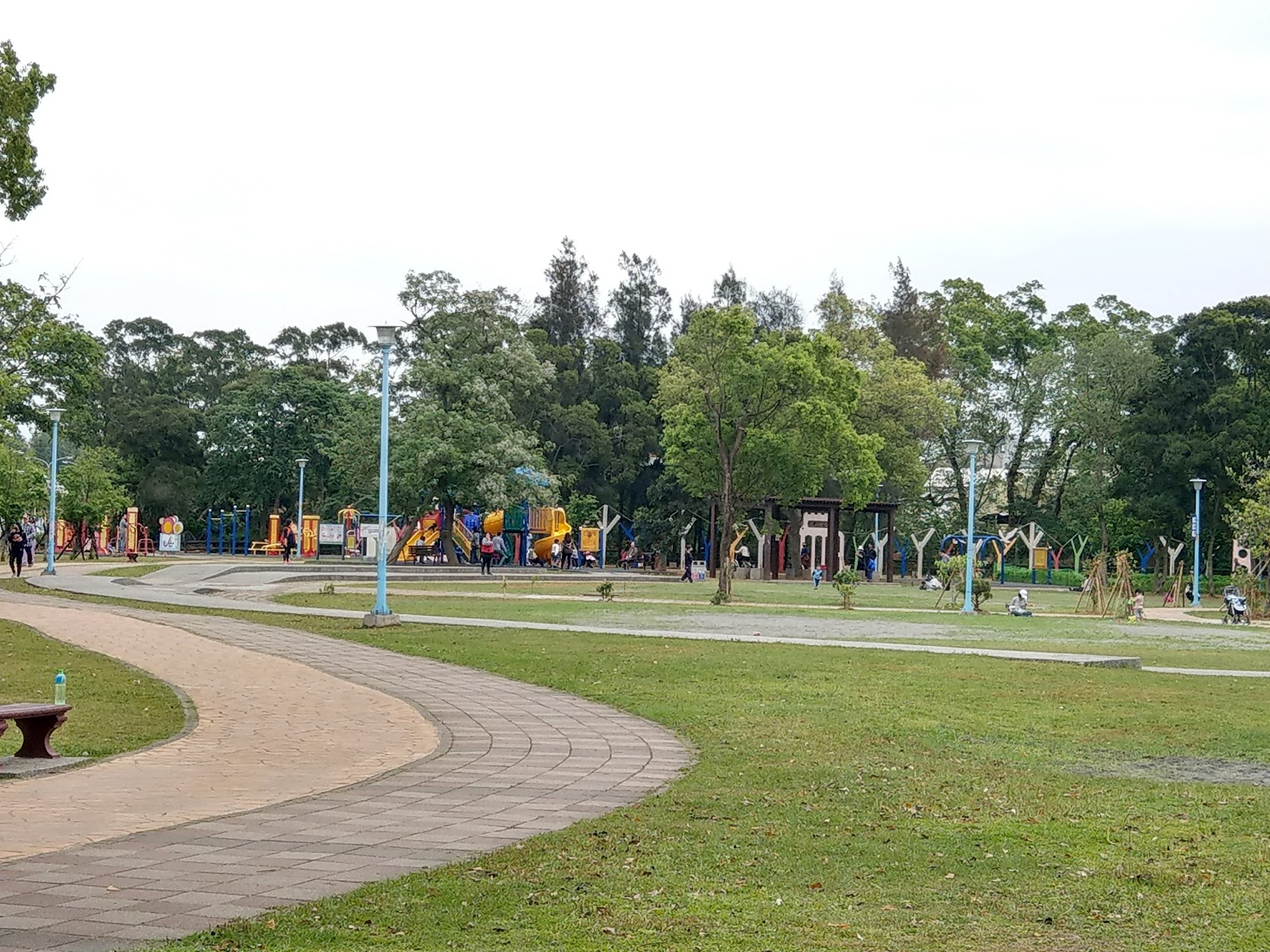 整體來說,公園的環境維護得相當不錯。步道平坦好走,周圍的樹木與草坪也修剪得十分整齊。公園中央設有一座大型棚架,旁邊則是小朋友的溜滑梯遊戲區,非常適合來散步、放鬆,或帶孩子來放電。