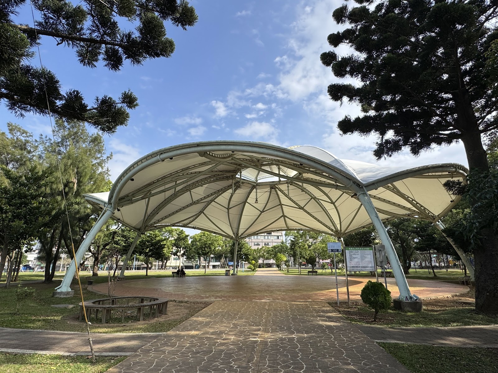 還有幾個小涼亭,以及超級大的白色遮陽棚,遮蔭效果特強,我看起來這是桃園市全面性設置於各區域大小公園的風雨亭吧!附近龍德公園也有一個較小造型的白色遮陽棚。
