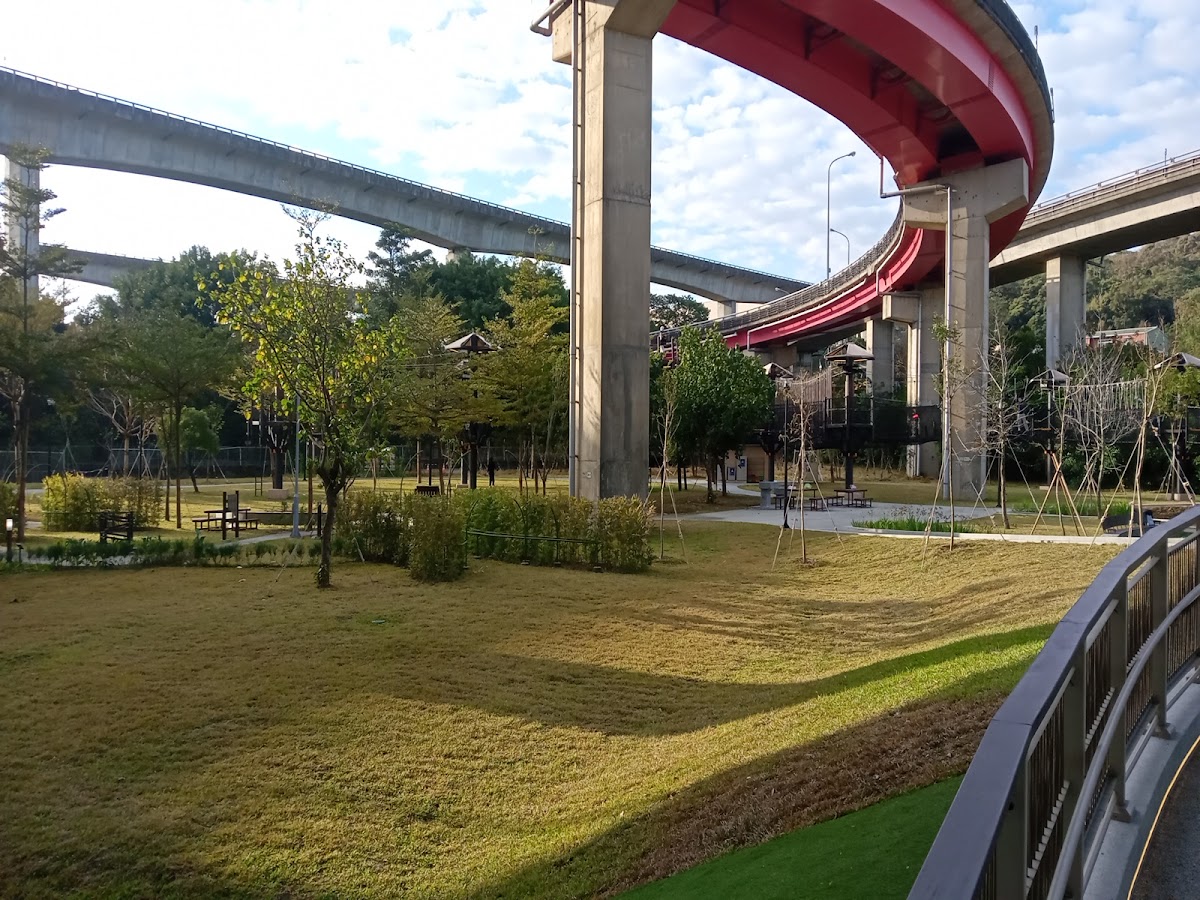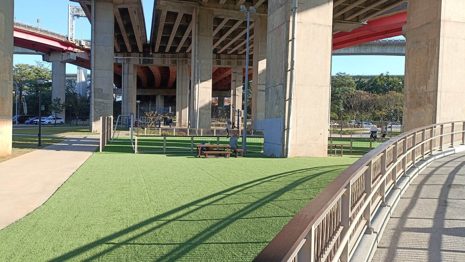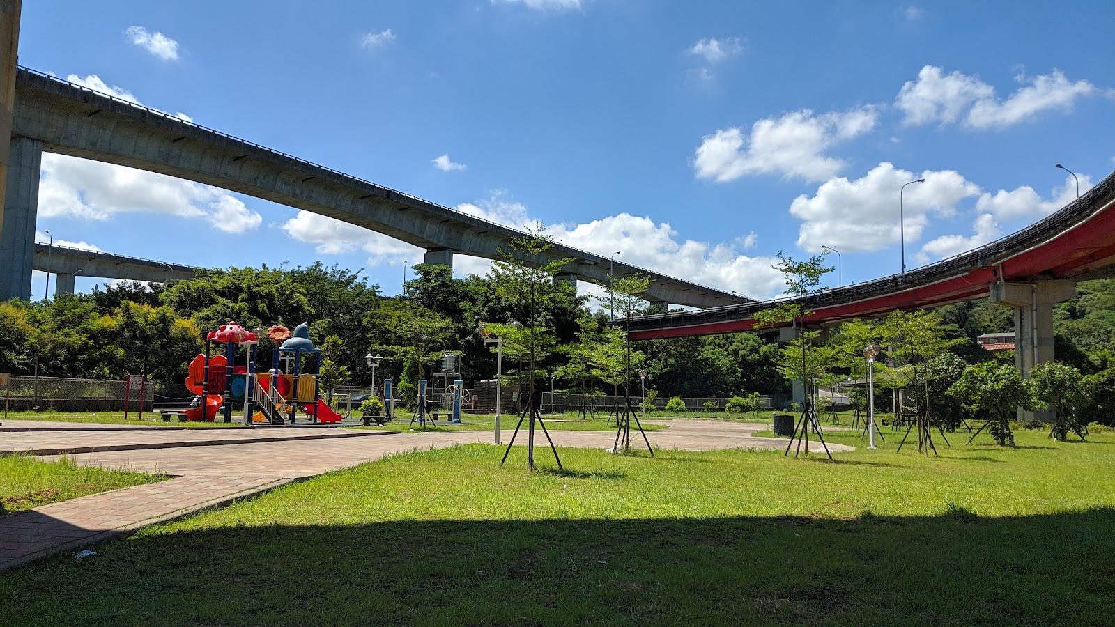 園區空間滿大的,高速公路劃分成三個區域,一邊有籃球場,兒童設施跟越野遙控車場地,對面有造景池塘。高速公路涵洞的另一邊場地比較大,兩座籃球場,兩組兒童設施跟沙坑,有廁所跟玩沙坑專用的洗手洗腳台,不過在缺水旱季有可能會停水,也有數個涼亭,缺點是位於高架橋下,噪音偏大,而且籃球場沒有圍籬,場地都是沙