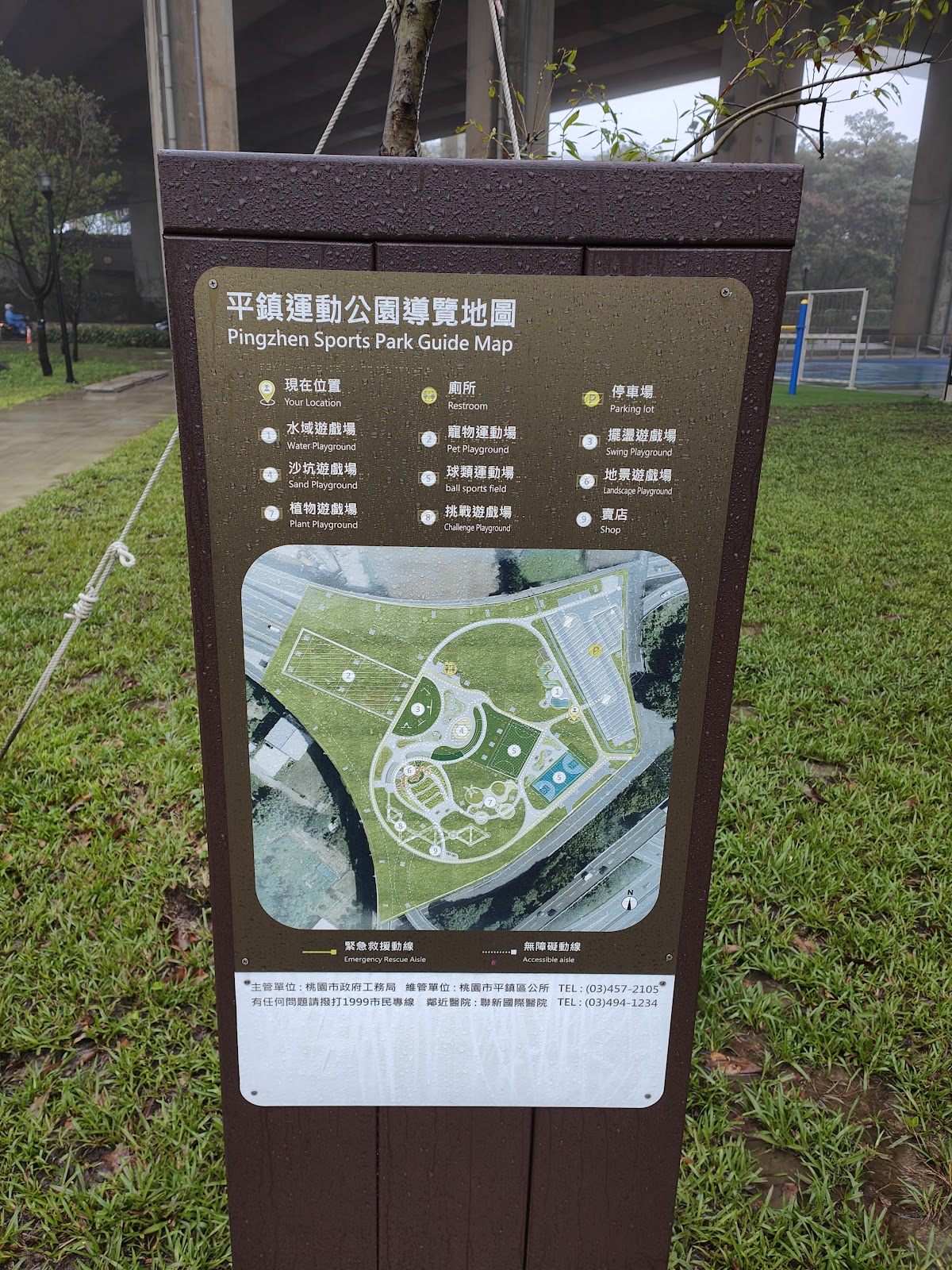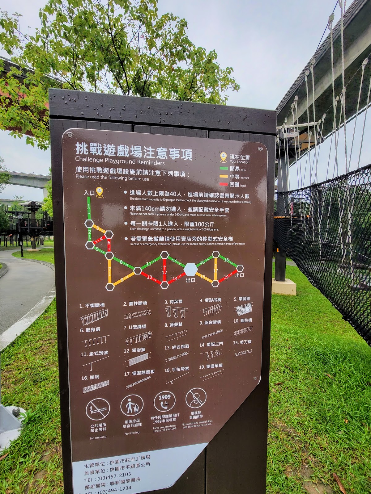 位於66快速道路下方的平鎮運動公園,園內附設停車場/公廁/涼亭/19項挑戰性娛樂設施/盪鞦韆區/籃球場/五人制足球場/寵物休閒區,整體來說佔地夠大,遮陽處多(橋下),19項挑戰性娛樂設施真的很有挑戰性,不過中途放棄的中繼點不夠,所以導致容易塞車的問題,請自行評估運動能力再決定要不要玩,因為上去了就中間段都沒有樓梯可以下來喔!
