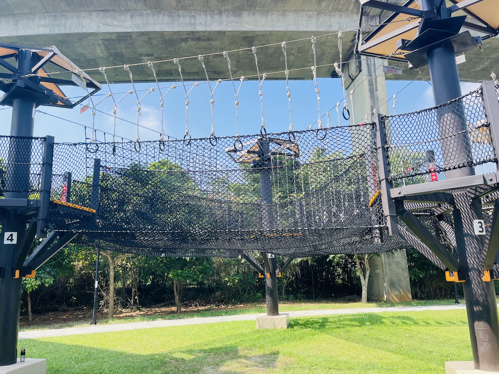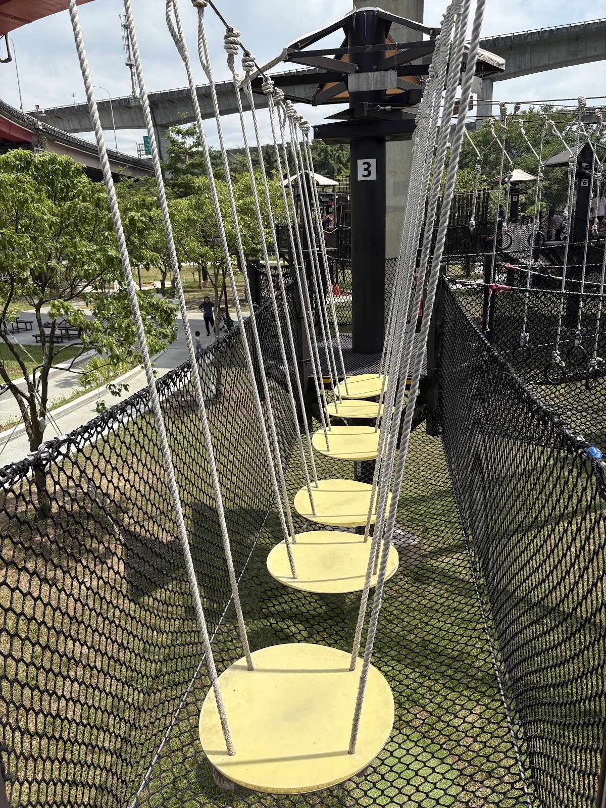 雖然每個關卡都有安全網或護墊,但大人小孩在此闖關還是得多注意安全,啟用後設施不到一週已經有些許耗損,或者被圍起來維修中。這是少見很具挑戰性的遊戲場,確實蠻需要養護單位的定期照護!