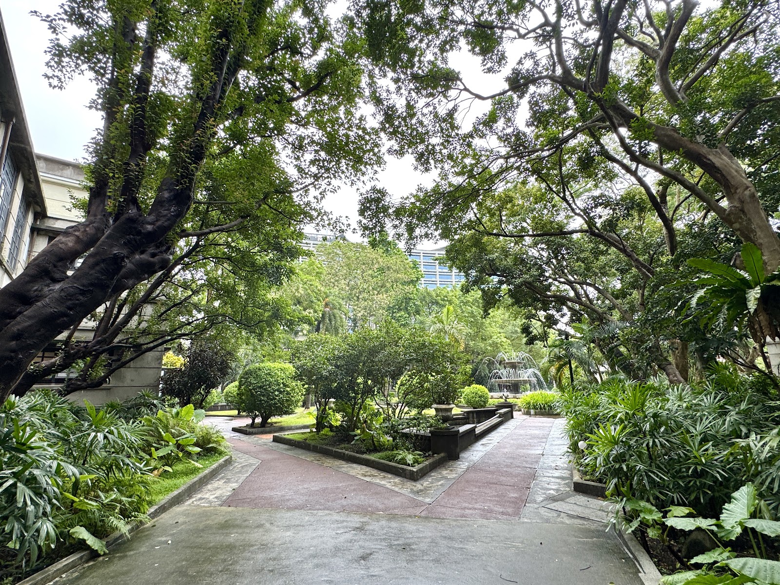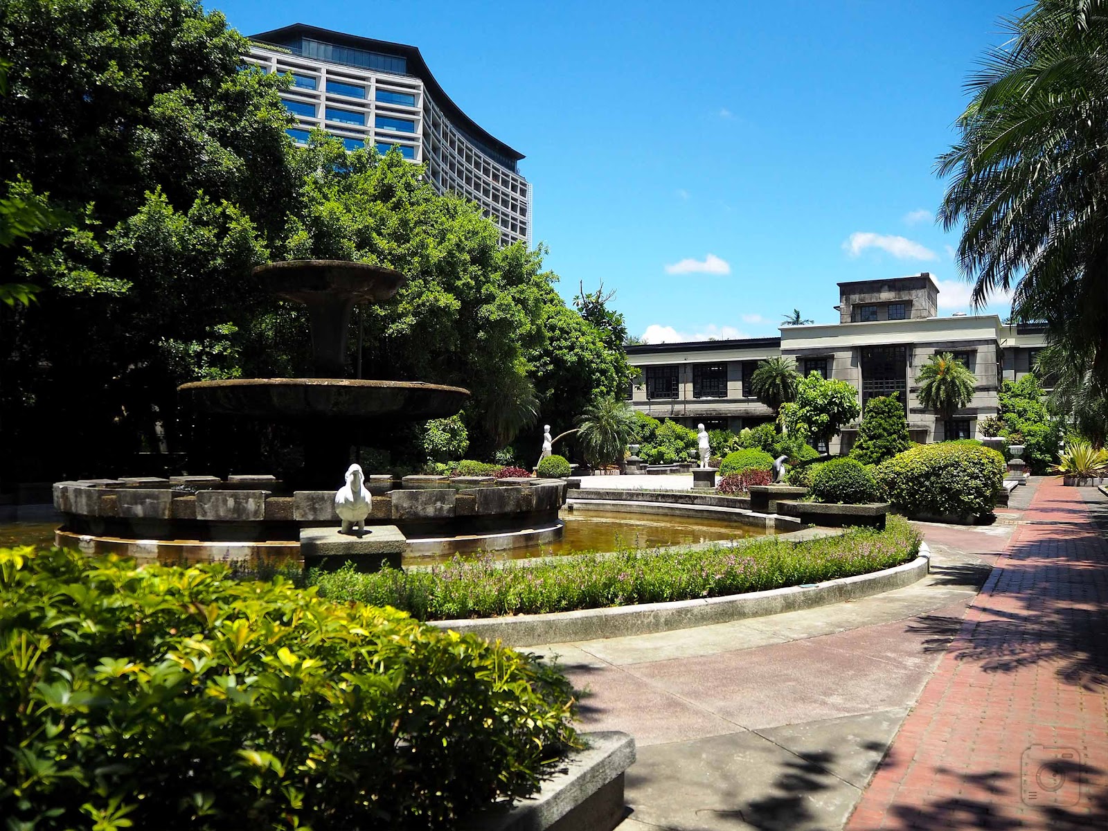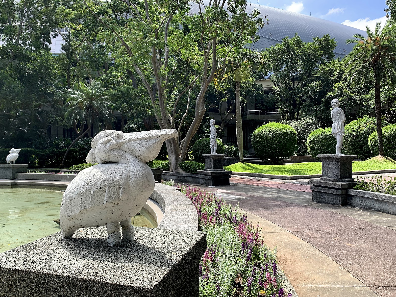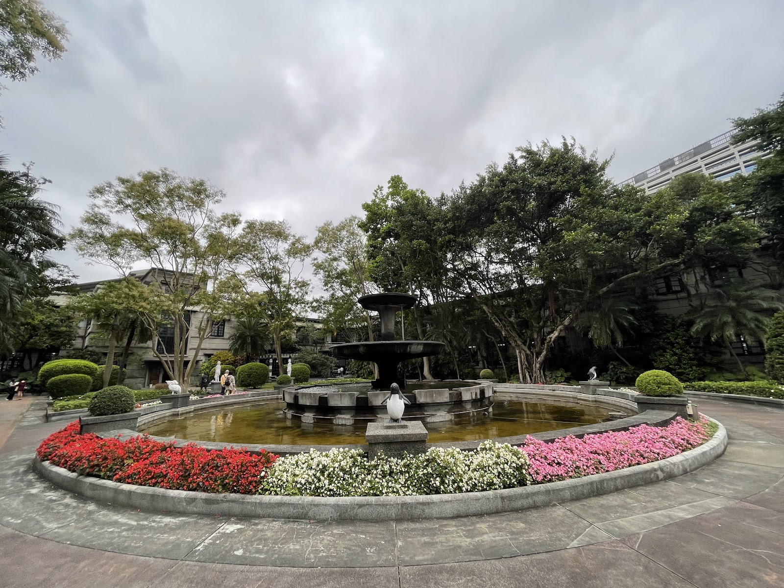 臺灣的花園造景真的好可悲,明明就很漂亮的花園,一定要有噴水池塘,他們現在連水都不放,省水也不是這種省法…池塘也沒有水,該不會過沒幾年就計畫全部打掉換成木板桌了吧?真爛的造景,沒營養。
