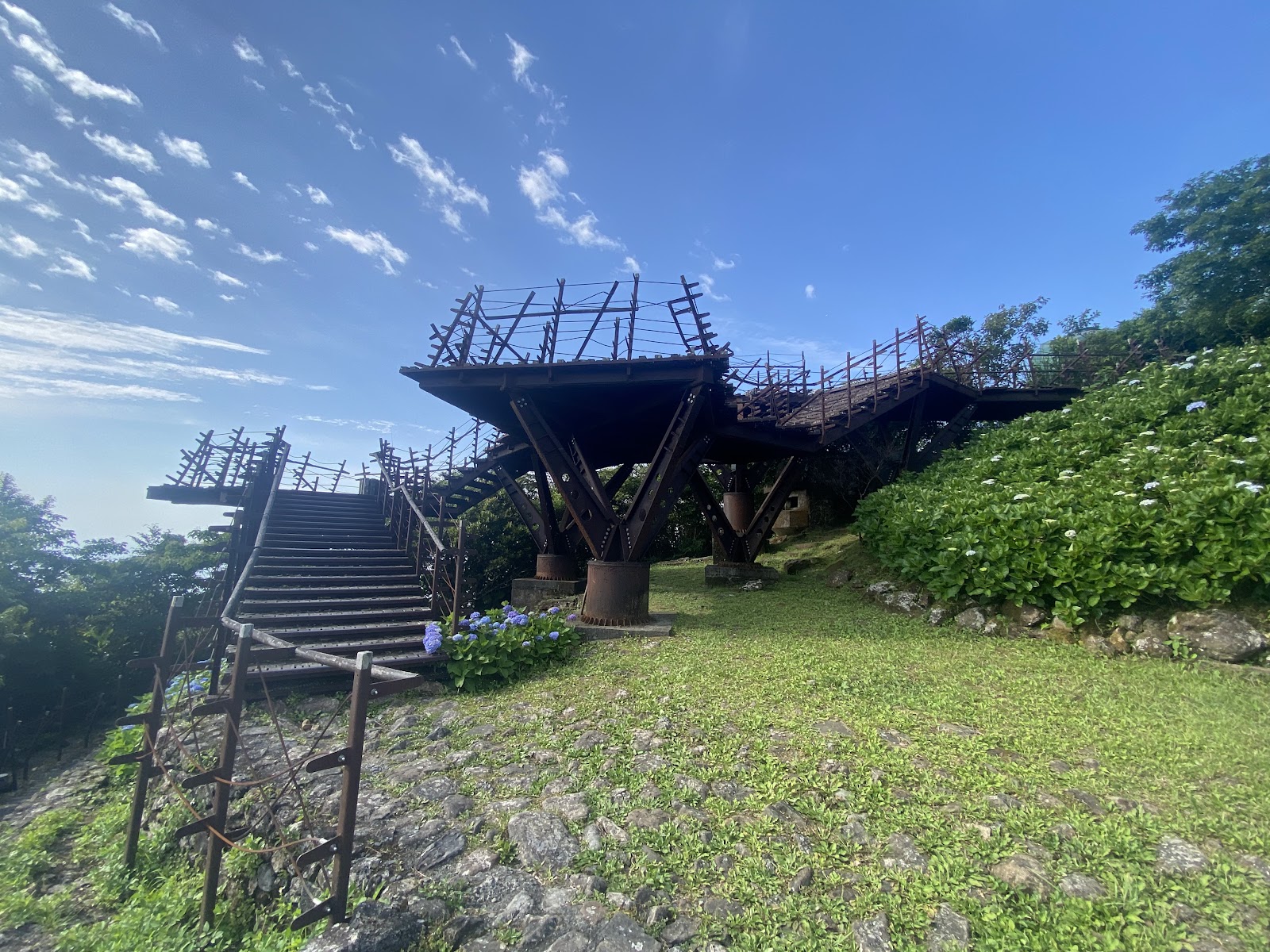 現在停車場施工中,觀景台施工中。目前繡球花還是滿開,花色以藍色為主,在陽光下會比較漂亮,期待公園在整修後能夠更加賞心悅目。