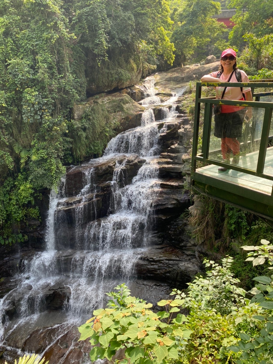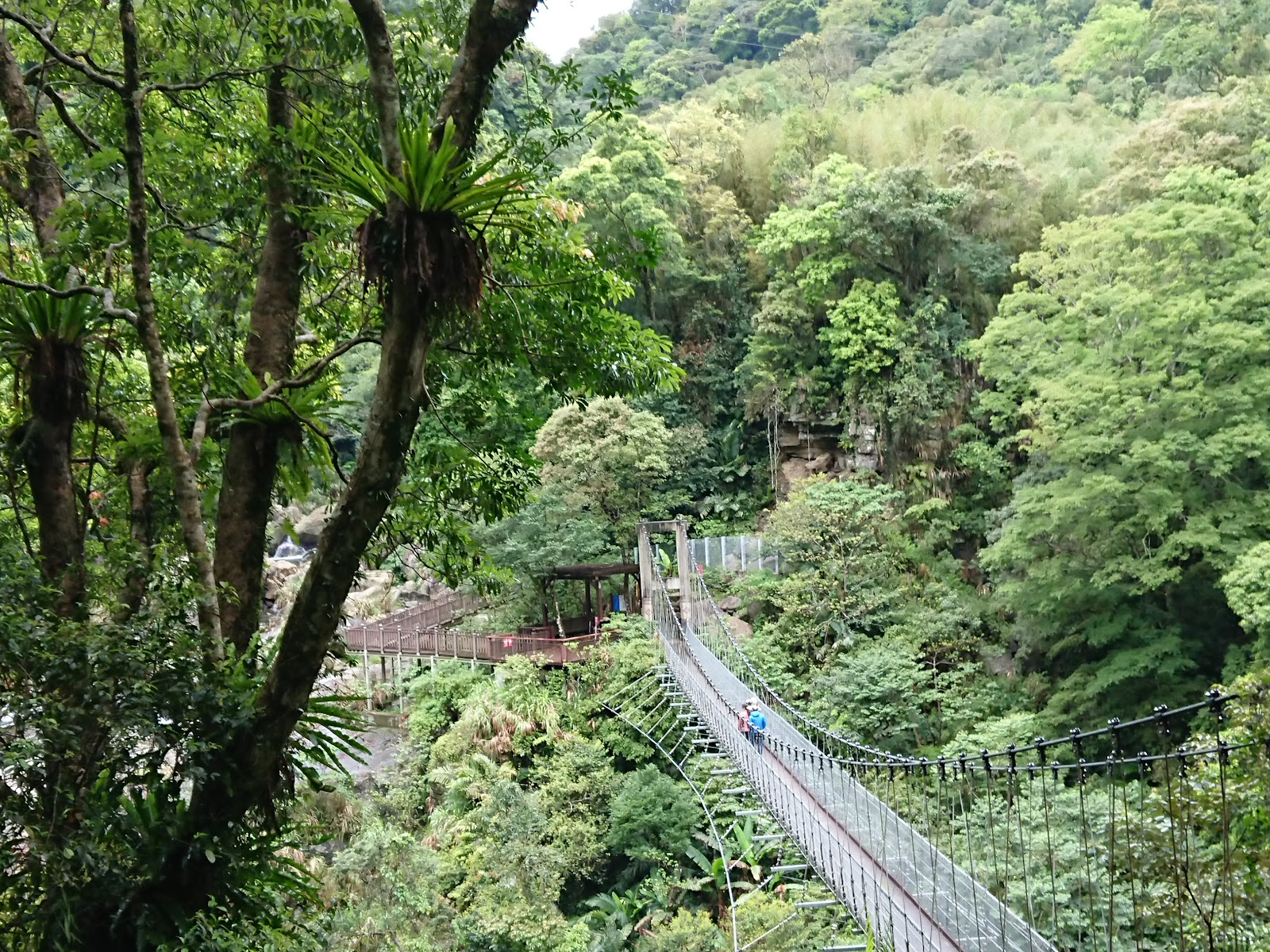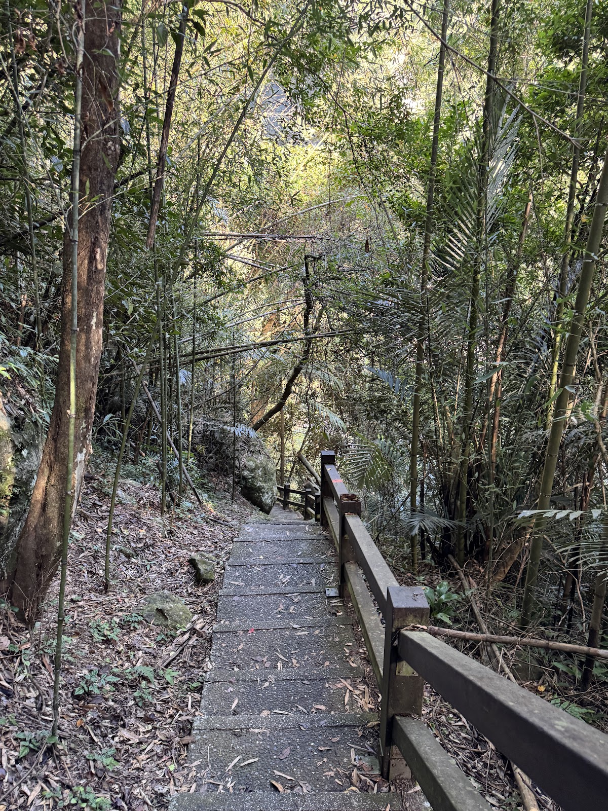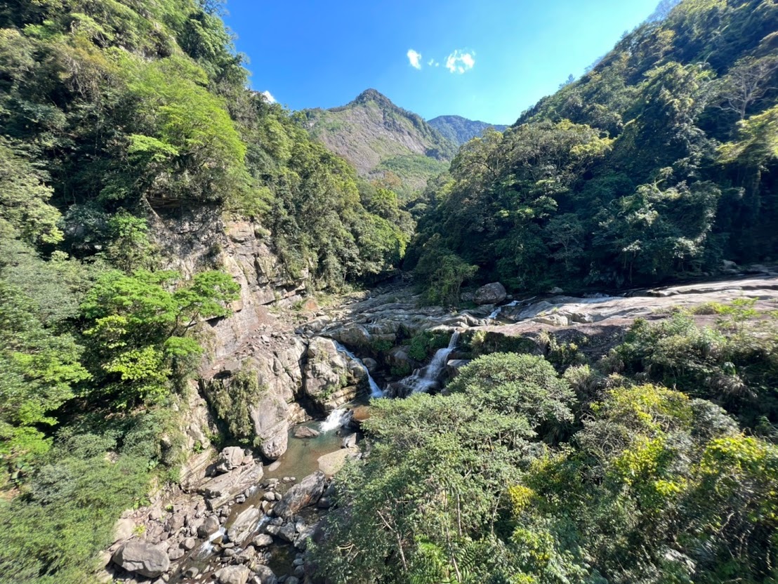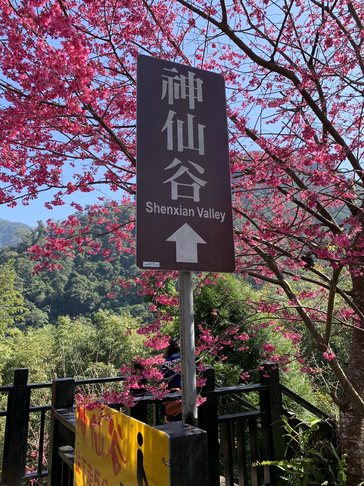 神仙谷入口處起初櫻花樹正盛開, 有私人收費停車格, 一旁的攤販說停車場的老闆今天不在就隨便停不用錢, 從入口處走木棧道階梯下去, 先看到的是七分醉原住民主題音樂餐廳, 餐廳門口有一隻大肥鵝呱呱的對著來往的遊客叫著, 繼續沿著階梯步道往下走, 經過巨石沒多久就來到溪谷了, 步道的盡頭有觀景平台, 一旁連接吊橋可跨越溪谷到對岸, 可惜吊橋有部分損毀目前是禁止通行(2月3日), 神仙谷是泰雅族人的祖靈聖地, 昔日稱為死亡谷, 是鄰近鹿場部落埋葬先人的地方, 曾經長年封閉, 在經過參山國家風景區管理處整修後, 現今山谷間設置了木棧道與刻有原住民圖騰的吊橋, 讓遊客能夠更安全的欣賞美景, 站在吊橋上眺望, 更能將神仙谷的美景盡收眼底, 橫亙在山谷中的巨石、壯麗峽谷,以及氣勢磅礡的瀑布群, 不禁令人讚嘆大自然的鬼斧神工, 而如此景色也吸引了導演魏德聖的注目, 成為了電影「賽德克巴萊」的拍攝場地之一, 神仙谷,是由鹿湖溪、鹿場溪、風美溪匯流切割而成的峽谷地形, 在夏季豐水期時, 壯闊的峽谷景觀以及傾瀉而下的瀑布景致十分震撼, 下過雨後雲霧繚繞於瀑布間, 宛若置身於仙境, 也因此有了「神仙谷」的美稱, 神仙谷景觀相當開闊, 分為上下兩層, 上層的岩床並不長, 奔流溪水將岩床勾劃出許多凹溝, 形成美麗的紋路, 下層與上層落差約30公尺, 由6、7層岩階組成, 水流從上傾瀉而下, 分成多道奔騰水瀑, 並在瀑底形成2公尺的深潭