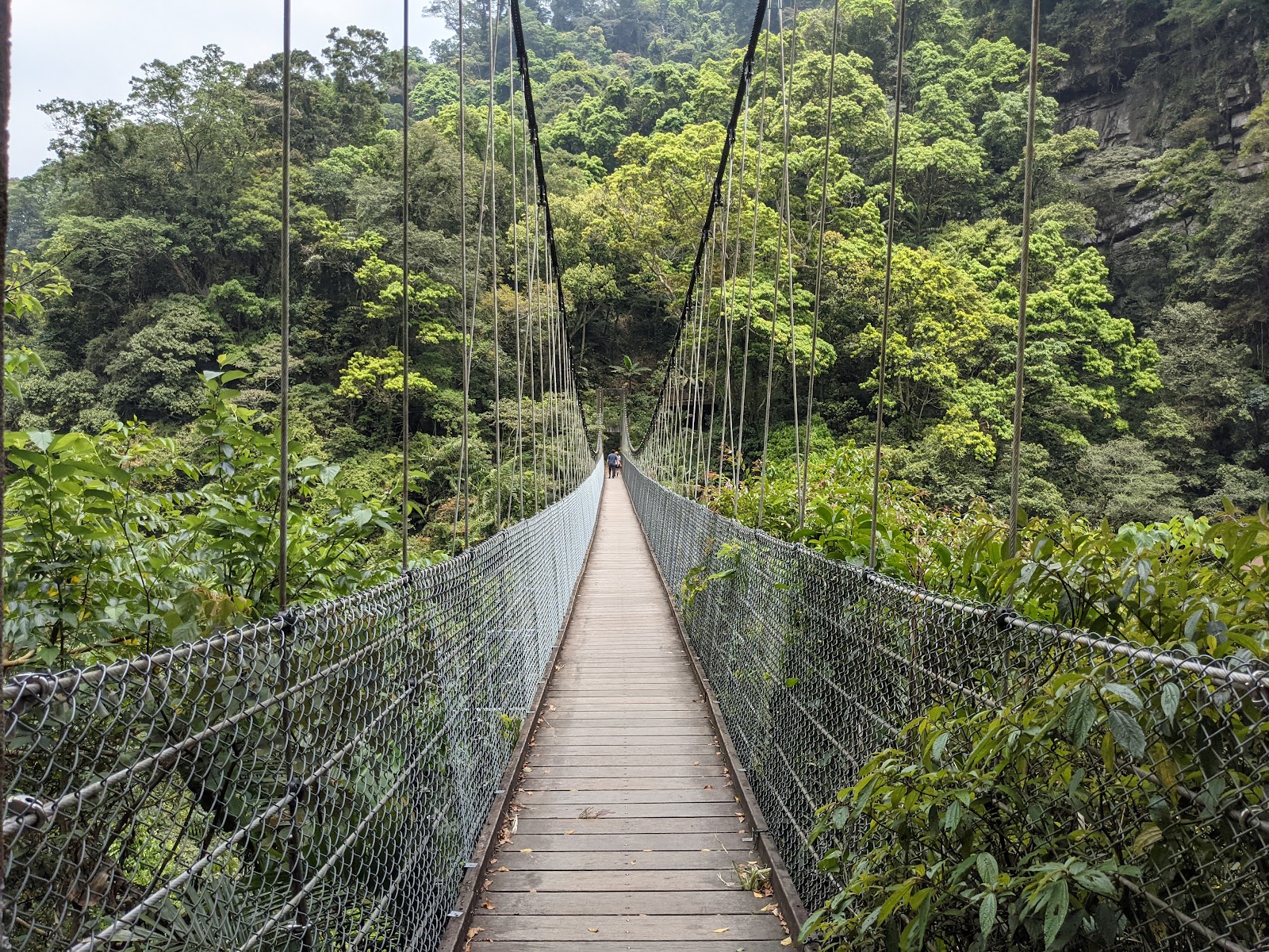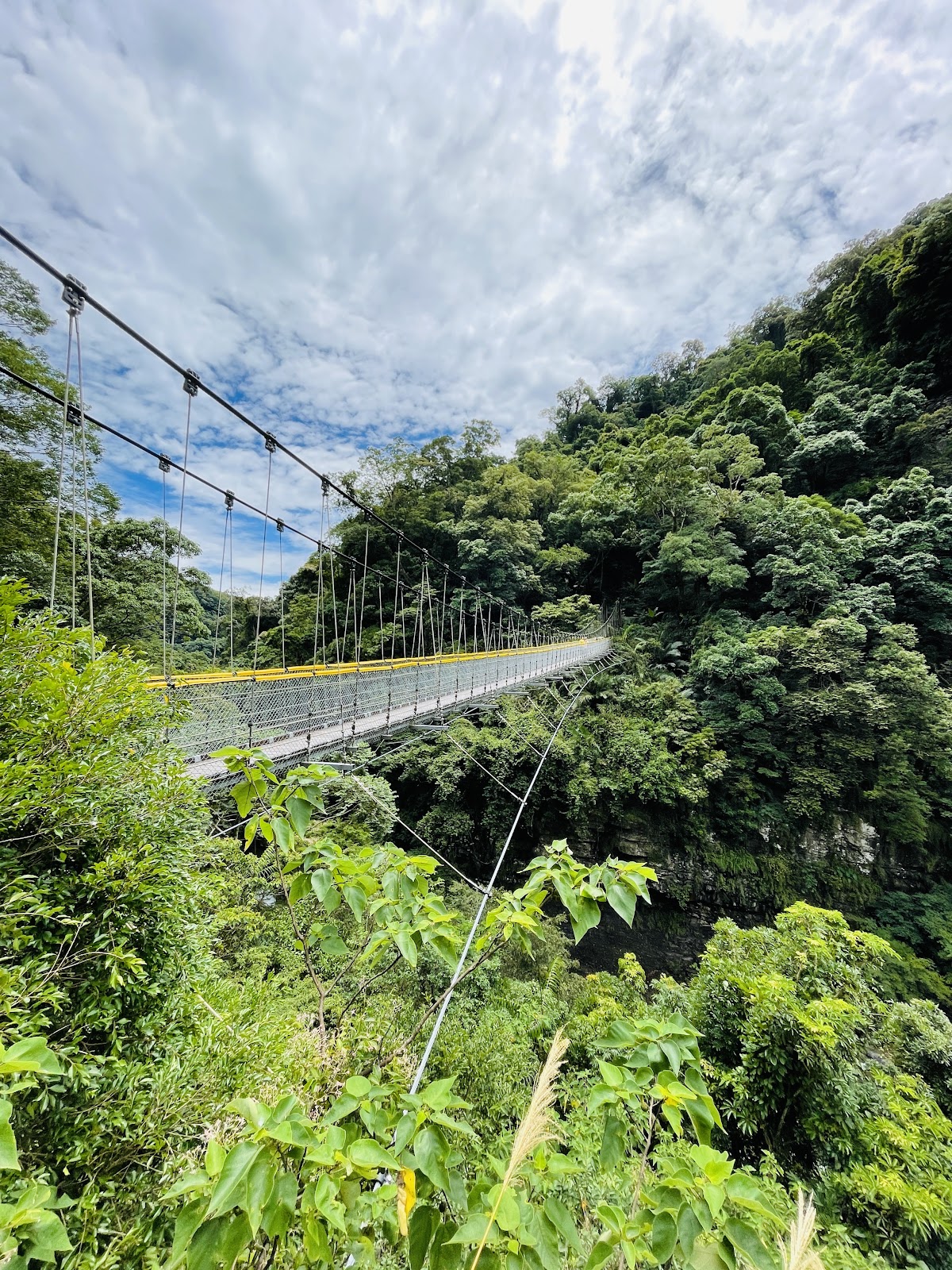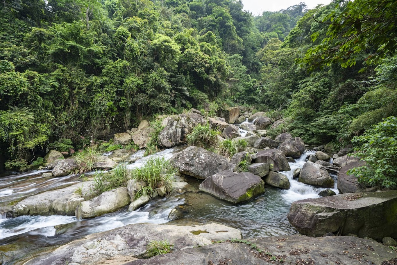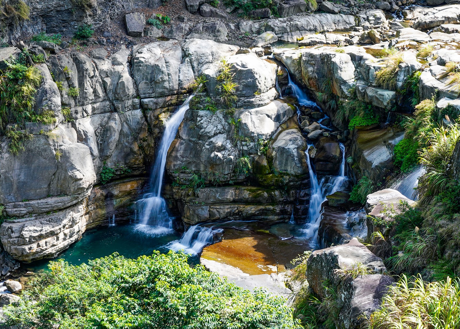 神仙谷入口處起初櫻花樹正盛開, 有私人收費停車格, 一旁的攤販說停車場的老闆今天不在就隨便停不用錢, 從入口處走木棧道階梯下去, 先看到的是七分醉原住民主題音樂餐廳, 餐廳門口有一隻大肥鵝呱呱的對著來往的遊客叫著, 繼續沿著階梯步道往下走, 經過巨石沒多久就來到溪谷了, 步道的盡頭有觀景平台, 一旁連接吊橋可跨越溪谷到對岸, 可惜吊橋有部分損毀目前是禁止通行(2月3日), 神仙谷是泰雅族人的祖靈聖地, 昔日稱為死亡谷, 是鄰近鹿場部落埋葬先人的地方, 曾經長年封閉, 在經過參山國家風景區管理處整修後, 現今山谷間設置了木棧道與刻有原住民圖騰的吊橋, 讓遊客能夠更安全的欣賞美景, 站在吊橋上眺望, 更能將神仙谷的美景盡收眼底, 橫亙在山谷中的巨石、壯麗峽谷,以及氣勢磅礡的瀑布群, 不禁令人讚嘆大自然的鬼斧神工, 而如此景色也吸引了導演魏德聖的注目, 成為了電影「賽德克巴萊」的拍攝場地之一, 神仙谷,是由鹿湖溪、鹿場溪、風美溪匯流切割而成的峽谷地形, 在夏季豐水期時, 壯闊的峽谷景觀以及傾瀉而下的瀑布景致十分震撼, 下過雨後雲霧繚繞於瀑布間, 宛若置身於仙境, 也因此有了「神仙谷」的美稱, 神仙谷景觀相當開闊, 分為上下兩層, 上層的岩床並不長, 奔流溪水將岩床勾劃出許多凹溝, 形成美麗的紋路, 下層與上層落差約30公尺, 由6、7層岩階組成, 水流從上傾瀉而下, 分成多道奔騰水瀑, 並在瀑底形成2公尺的深潭