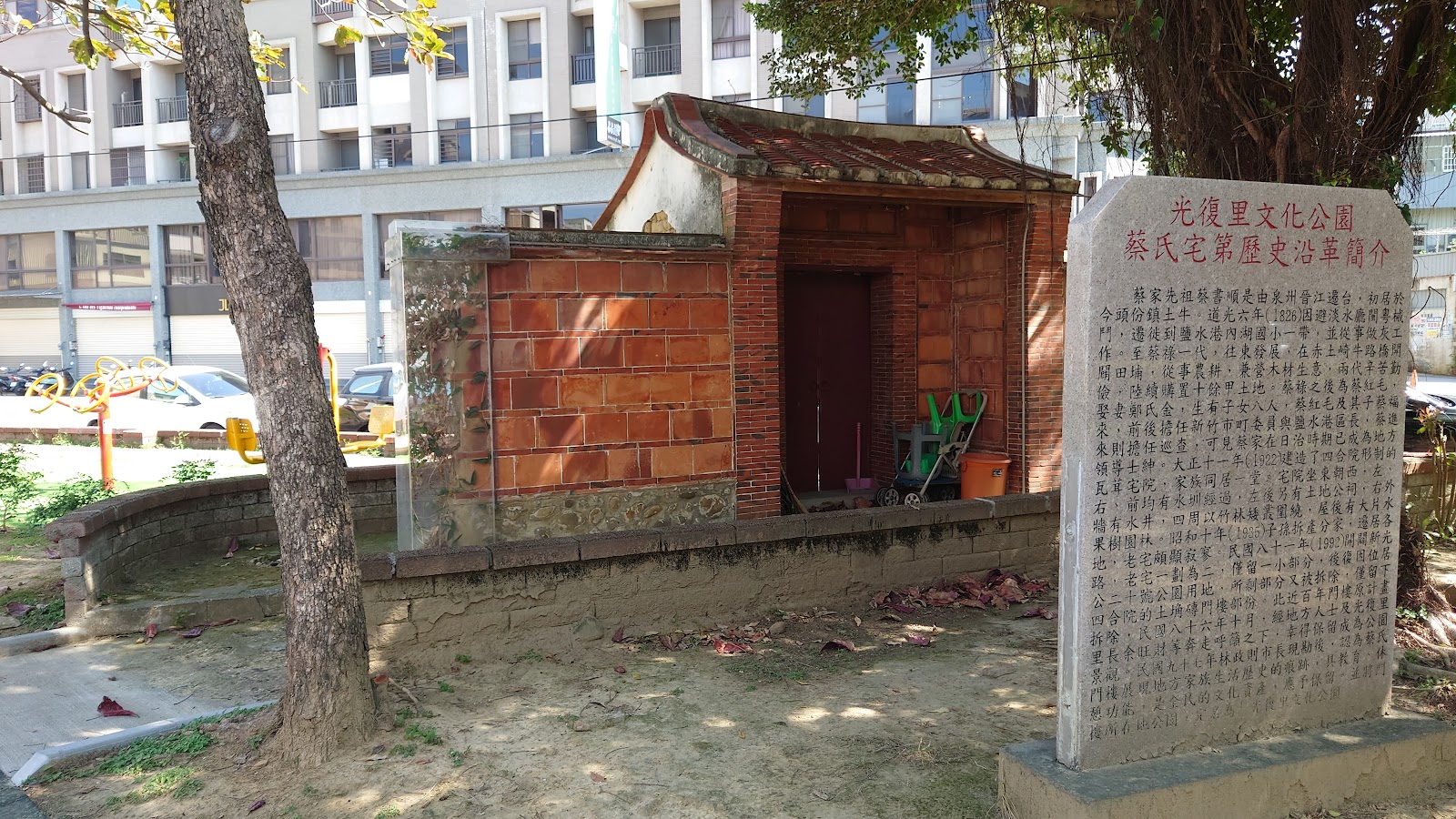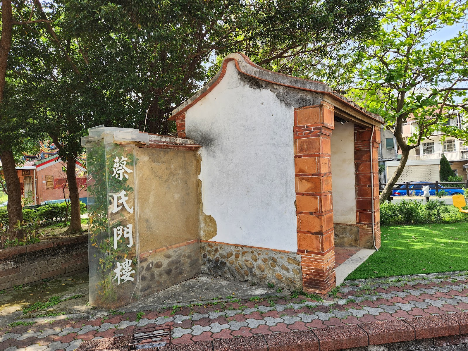 首頁 北台灣 新竹市景點推薦 文化公園 (蔡氏門樓) 文化公園 (蔡氏門樓) 看更多照片 共10張 景點位置 附近住宿 週邊活動 週邊景點 評價 景點位置 地址:新竹市光復里東明街183 附近住宿 日月光國際大飯店-新竹館 紫晶彩繪汽車旅館 新竹 微旅商旅 新竹 心園商旅 168motel 新竹館 更多新竹市住宿推薦 週邊活動 新竹櫻花景點|2026 新竹櫻花季開跑,7 大新竹賞櫻秘境一次看! 詳細介紹 2023新竹城隍廟美食攻略|11間老字號美食推薦!當地人帶你吃遍城隍廟口 詳細介紹 2022新竹景點一日遊|精選5大新竹景點 泡溫泉看星空 底片族朝聖之地! 詳細介紹 週邊景點 一品公園 評價: 人數:139人 新竹市綠園道食物森林 評價: 人數:181人 赤土崎公園 評價: 人數:317人 陽光走廊 評價: 人數:4人 日本帝國海軍第六燃料廠新竹支廠 評價: 人數:228人 更多新竹市景點推薦 評價 3.8 Grr 3/5 2022/12/23 在新光路和東明街的巷子中間,周圍有汽車停車位,還有一些未畫紅線的區域可以可以停車,在馬路上很容易找到,位置很顯眼 中小型的公園大小,樹木很多看起來稍微有點凌亂,裡頭有個刻名蔡氏門樓的建築,後方有石碑介紹古厝的歷史沿革,但其實看起來跟雲林裡的老式建築很像,且門樓已經不完整,在這裡很佔位置,可以考慮喬遷到史蹟館內,園區裡能走動的空間不多,設有三種基本的兒童設施溜滑梯、翹翹板、搖搖椅以及成人的運動器材,旁邊有休息椅可以臨時休憩 民族救星 4/5 2022/10/30 很小的公園,古蹟的部分就剩一座門,旁邊有土地公廟,還有一些健身設施 夏琳愛旅遊 4/5 2022/06/14 這樣的古蹟一定要好好愛惜,讓後人見證歷史的軌跡,雖然保留下一小部分門樓,不過也拆掉太多了,很可惜。 劉Charlene 4/5 2022/06/14 這樣的古蹟一定要好好愛惜,讓後人見證歷史的軌跡,雖然保留下一小部分門樓,不過也拆掉太多了,很可惜。 蔡大緯 4/5 2022/01/08 沒仔細看你還不知道有古蹟在此。 林玟圻 4/5 2019/08/19 地點雖位於四線道馬路旁。但是卻無車輛喧囂之吵雜。其中還有一些孩童娛樂設施。適合媽媽帶孩子來休憩發洩孩子的精力。 資料來源由Google提供