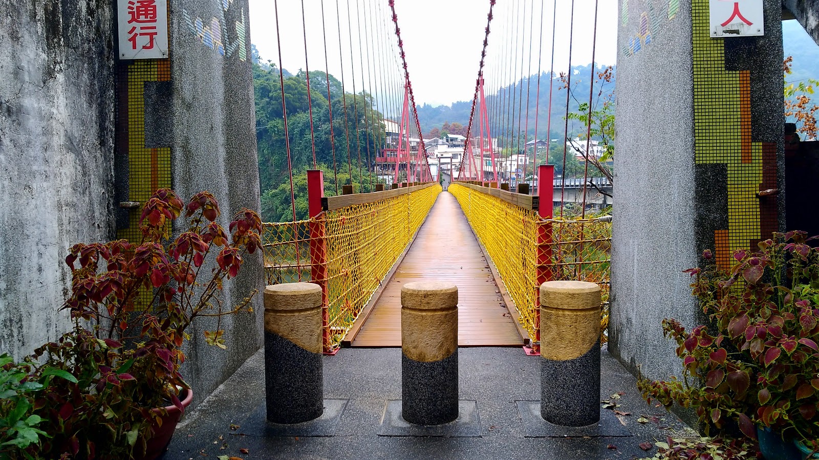這裡環境清幽,溪聲潺潺而寧靜,與隔壁熙熙攘攘的陸橋有著強烈對比。這座吊橋以前應該是生活必經之路,褪色的鋼纜塗層,與新鋪設的木色步道,有強烈的差異,更彰顯新與舊的融合,