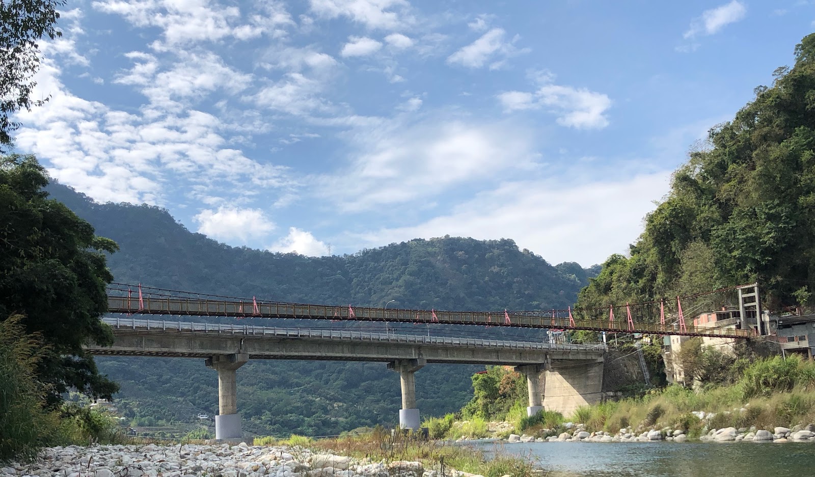看得出來吊橋是以前當地人在走的,連接兩岸的重要設施,當旁邊的水泥大橋蓋好後,它的任務也跟著結束了。走在橋上,想像數十年前!它的人來人往!好不熱鬧。