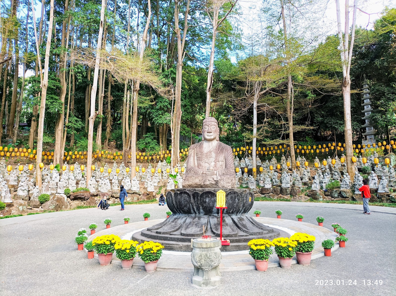佛寺門口的黃色燈籠沿著樓梯往上攀延,一步步走上去覺得內心特別平靜,走完樓梯佛寺入口前面有一個迴廊造型的水池和步道,進入到佛寺大殿的正後面還有一個木造的小佛堂,有點韓國佛寺的風情,入口的右邊沿著步道,可以繞一圈佛寺,會先遇到蓮花座,看很多網美都會座到桌子上拍照😅別有一番風情,再往下走會遇到五百羅漢,不得不說,拍照看到的感覺都覺得還好,親眼一見,非常的壯觀和震撼!沿著八卦陣慢慢走一圈覺得身心都被洗滌了