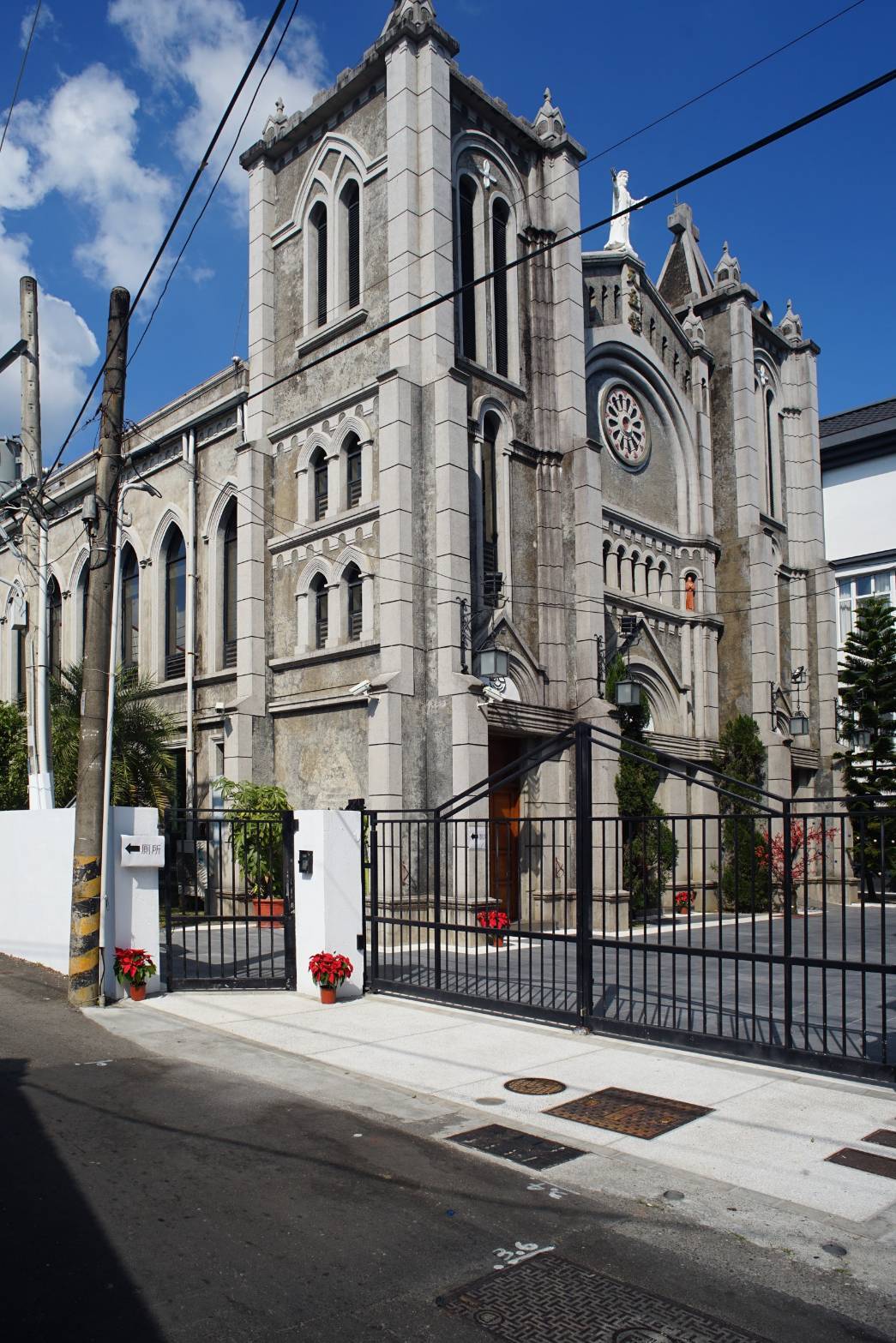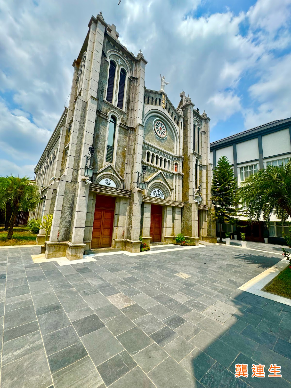 已有六、七十年的光陰,天主堂的造型典雅,是棟仿歌德式風格的建築,立足欣賞三層樓高度雄偉壯觀的正面,正上方立著栩栩如生的耶穌雕像,兩側各搭配有高塔ㄧ座,並以洗石子建構出高聳巍峨的牆面,