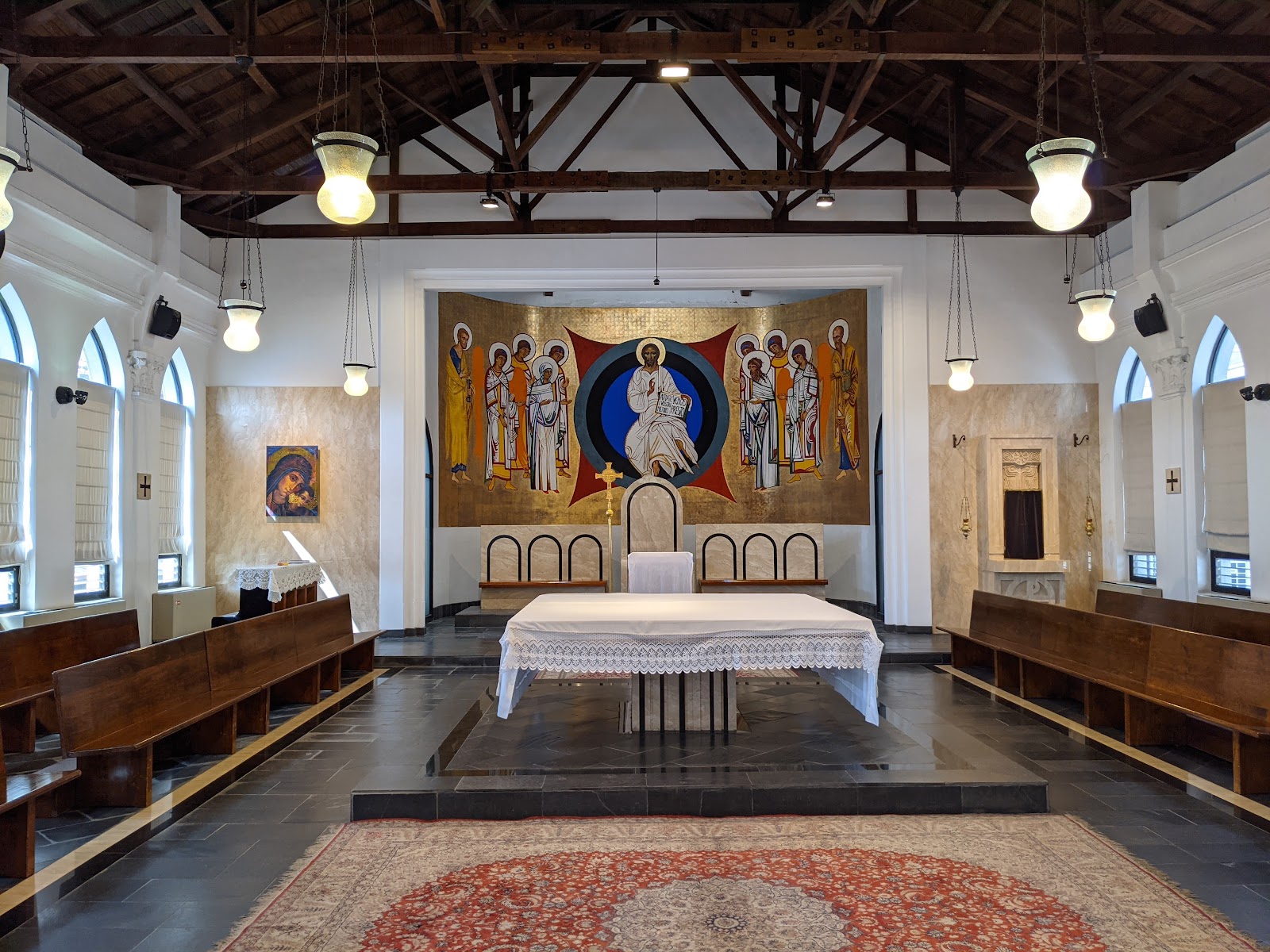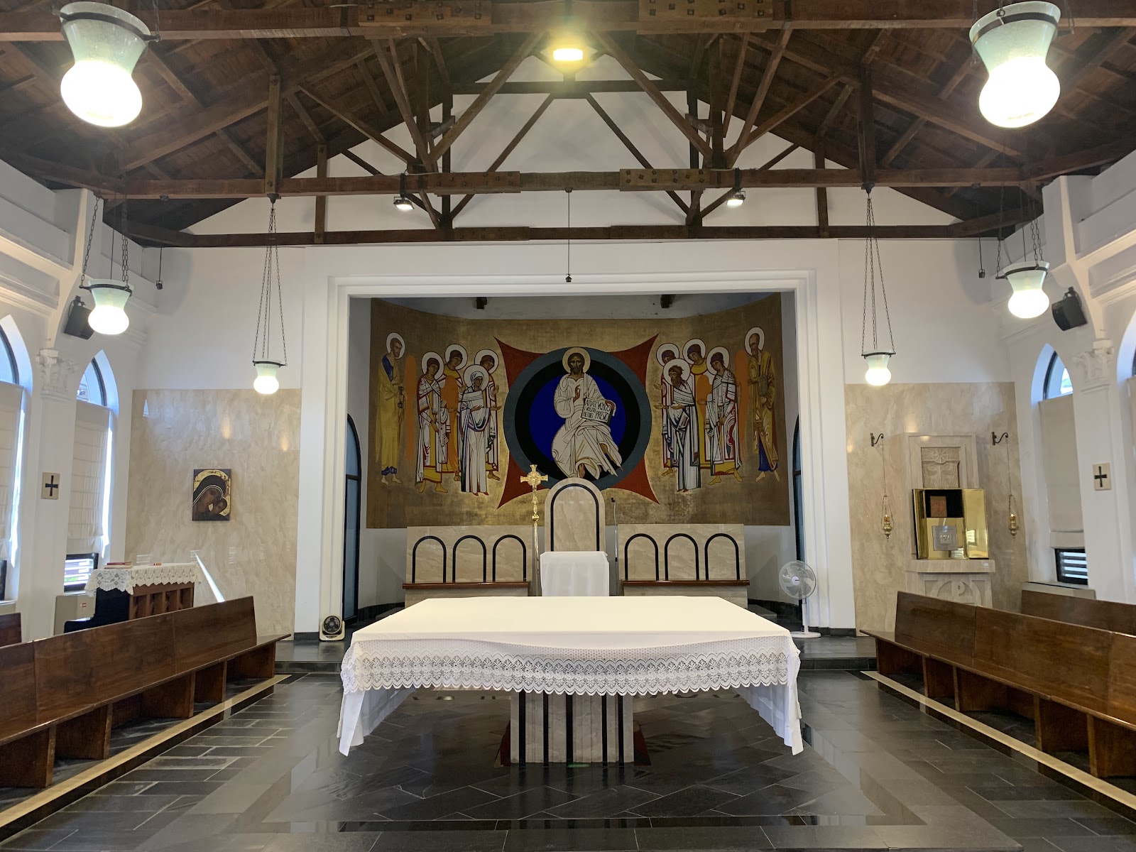 天主堂、兩旁窗戶崁入尖拱的採光玻璃,和煦光線進入明亮潔淨的內部空間,映照出栩栩如生的壁畫,樸實無華的神聖殿堂,是眾人們心靈上的支柱與精神糧食~平安喜樂!