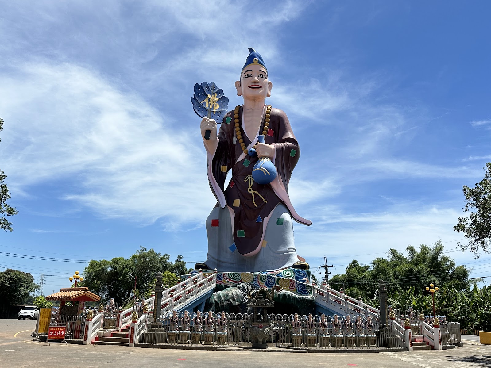 濟公活佛巨像矗立在一片蔗園中,成為旗山地方的地標,十分醒目。兩側殿牆上鑲嵌了1300餘座小濟公像,非常壯觀。站在最高層,可一覽旗山平原無邊際的蕉蔗園及椰林風光。