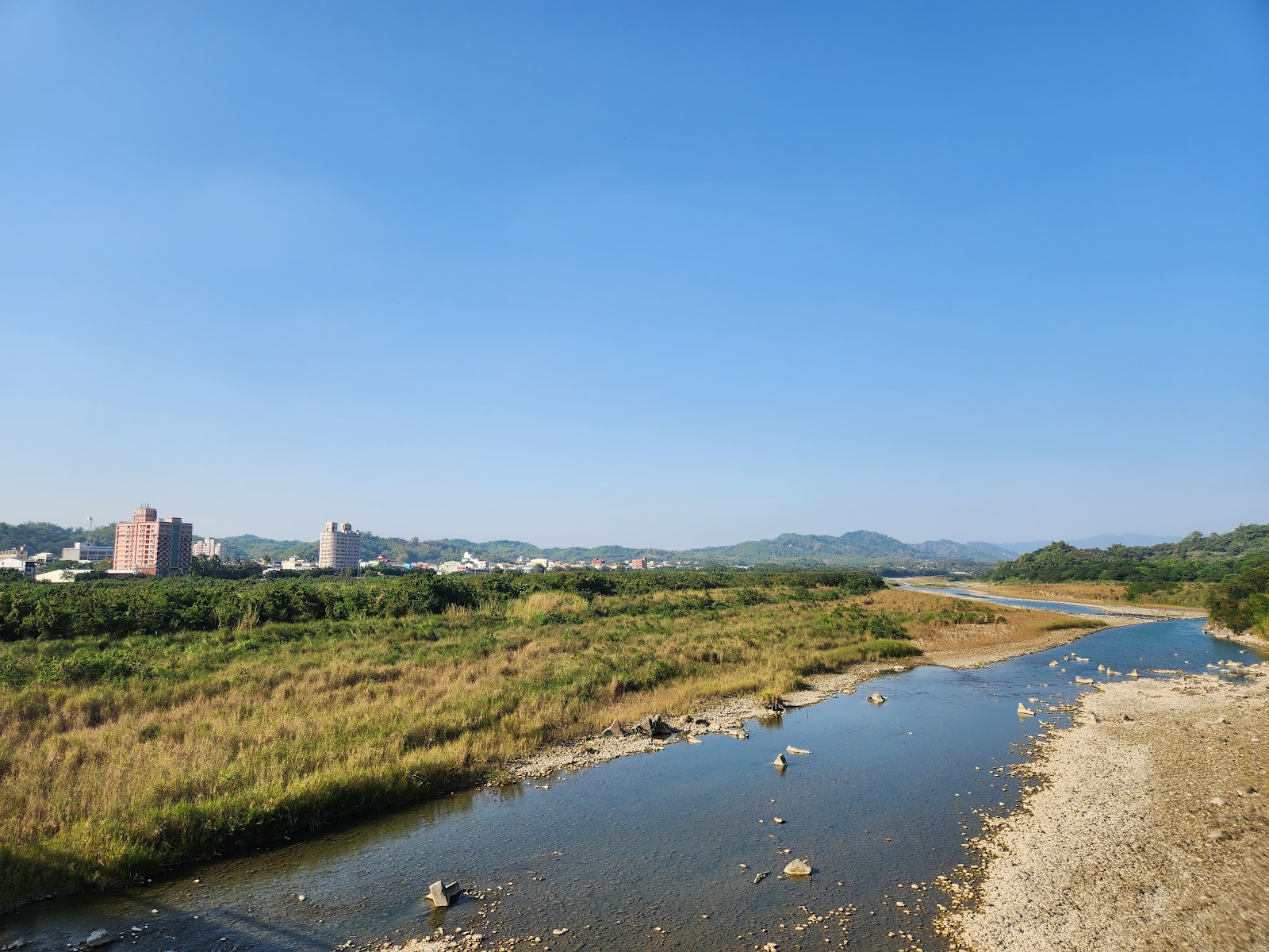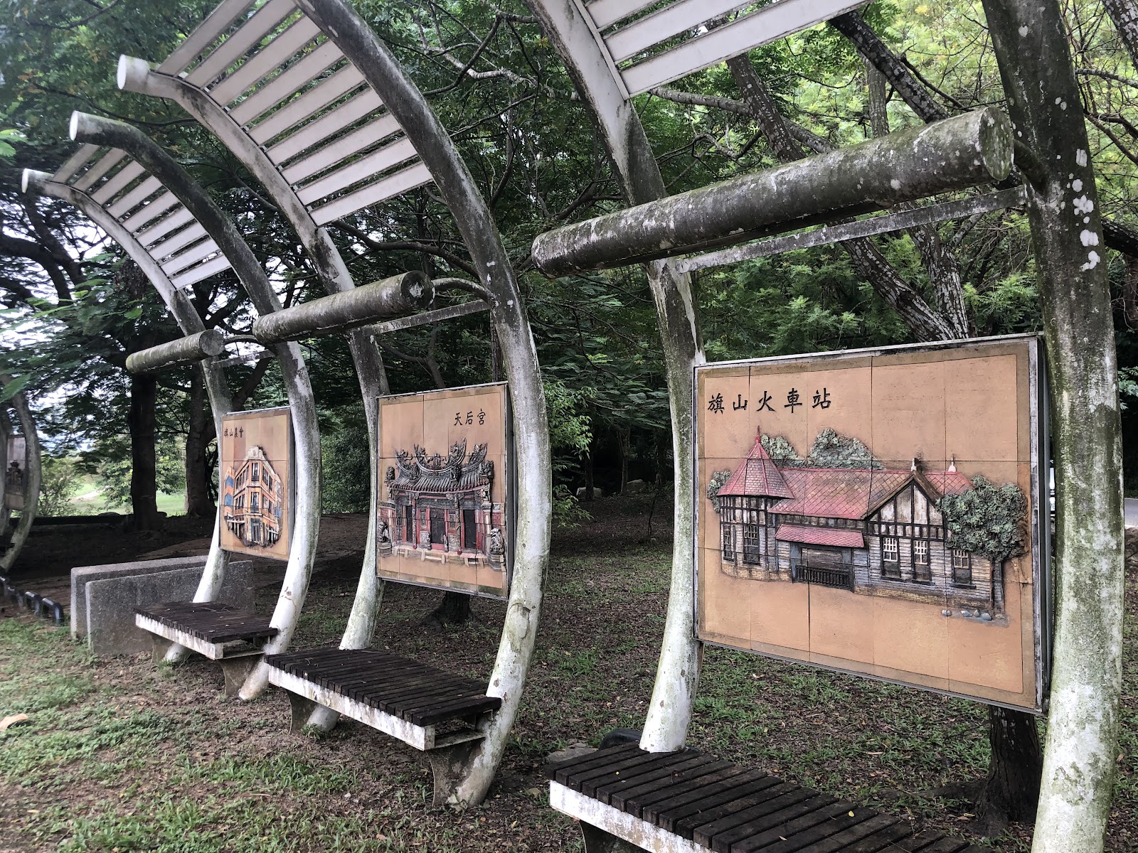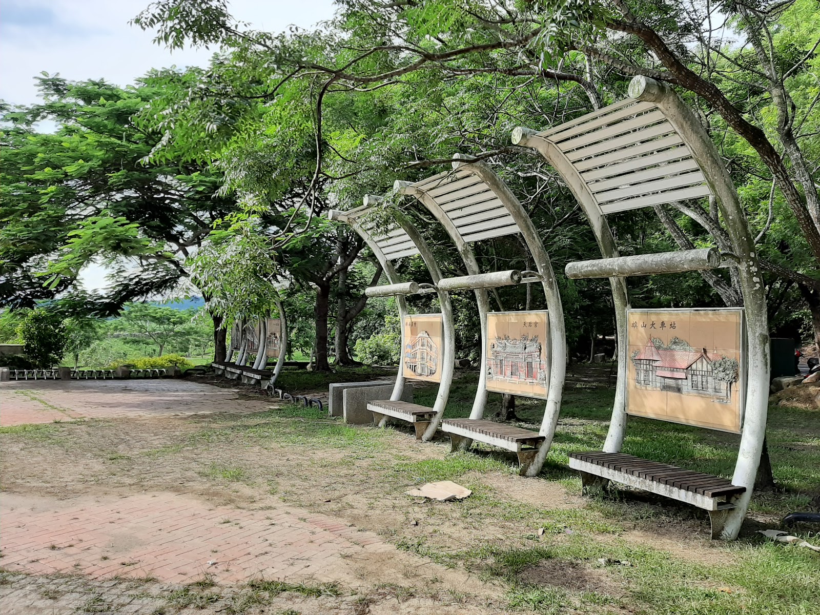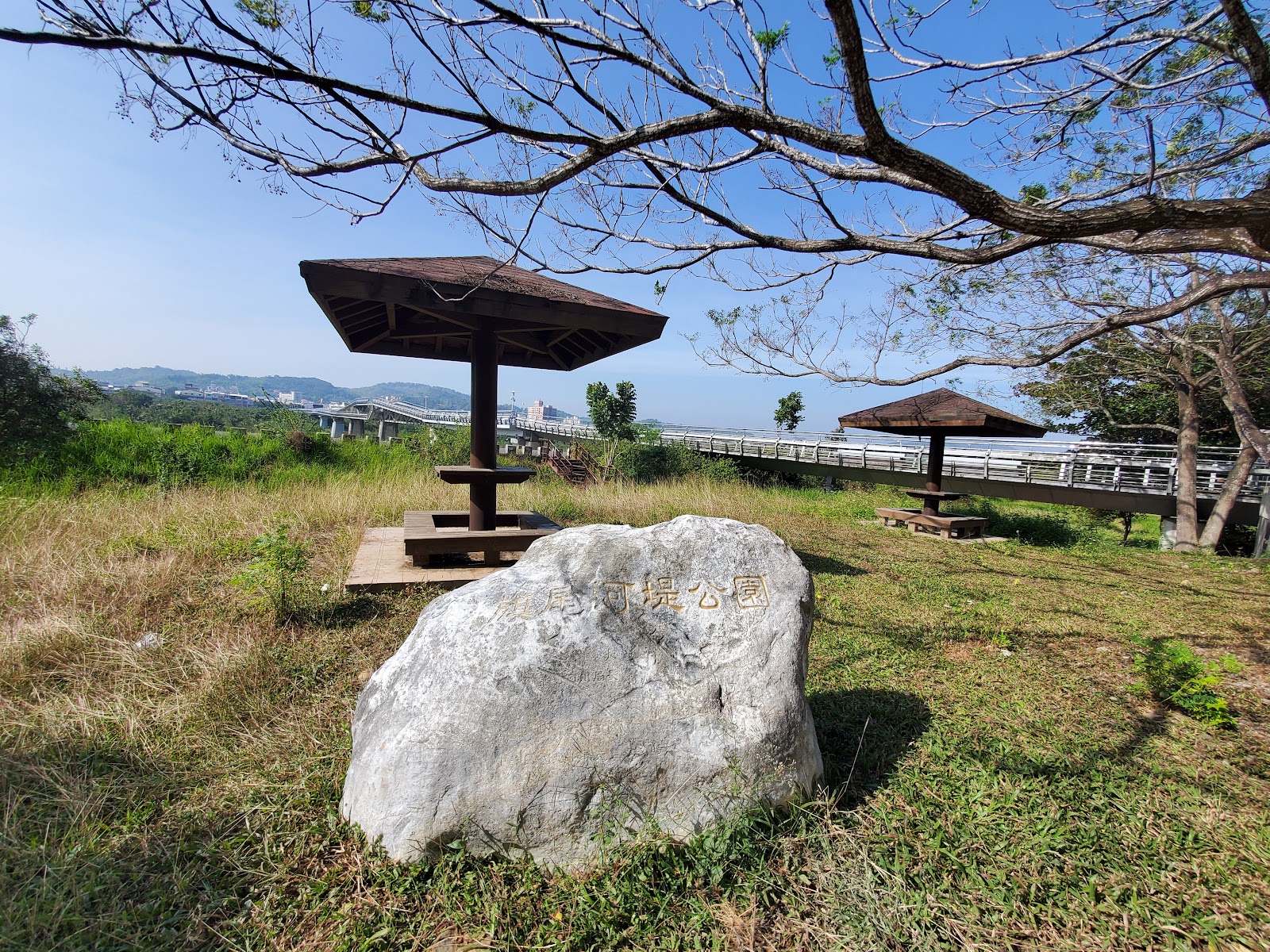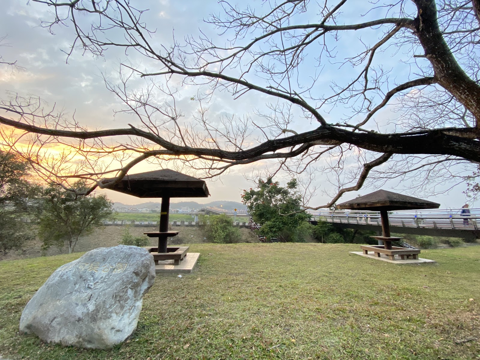 喜歡把車停在“旗尾河堤公園”旁的停車場,走路2-3分鍾,可走“旗山溪景觀主題步道橋”,走到對岸,剛好可逛“旗山老街”。河堤公園不大,有涼亭,可看旗山溪風光,看夕陽也不錯的點。