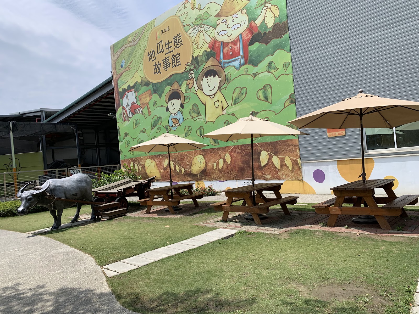 小觀光地點地瓜可口 農場加工廠 熟食區 大停車場 藝品商店樣樣具備 導遊領隊會介紹全部過程 外頭還有隻大寵物