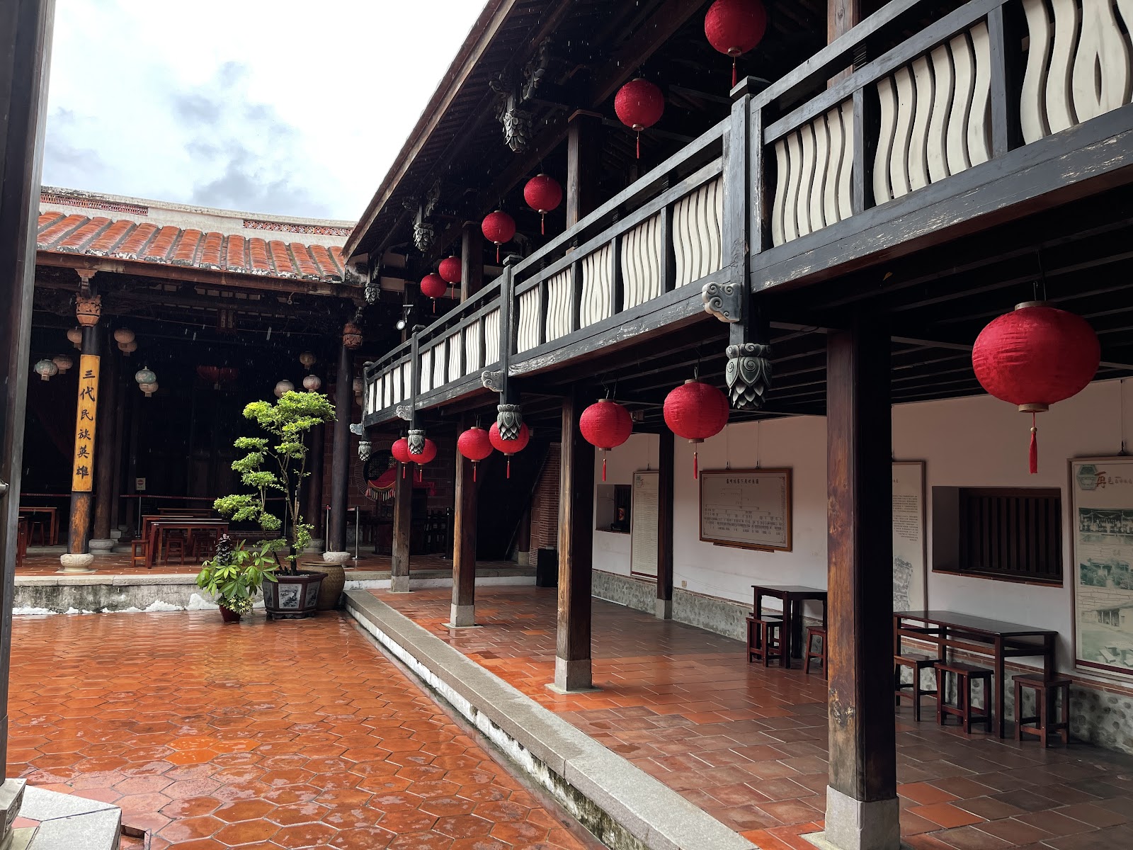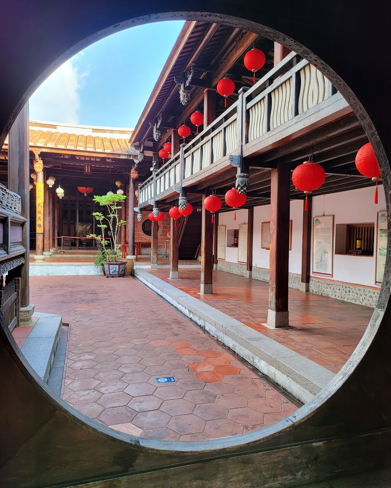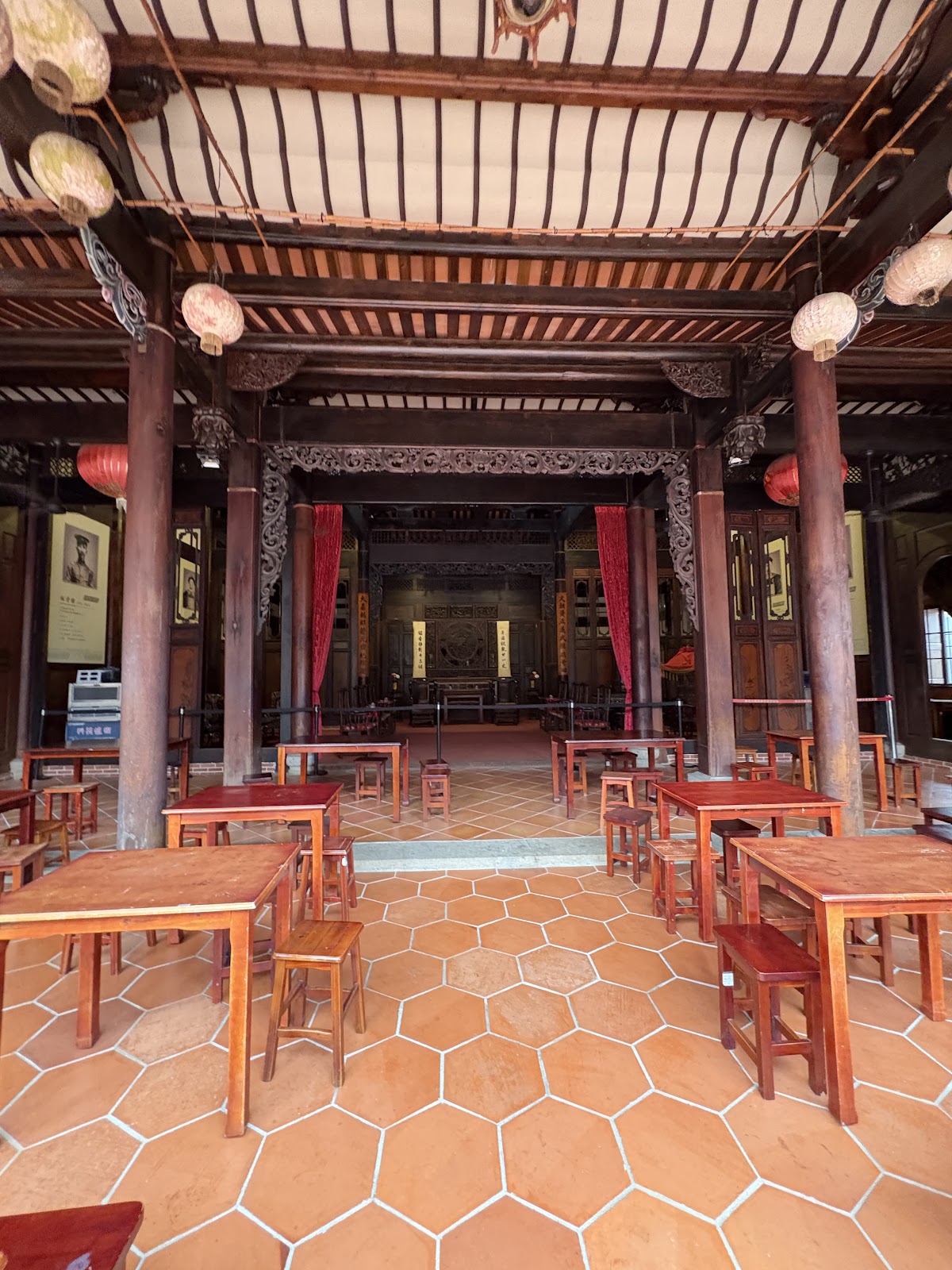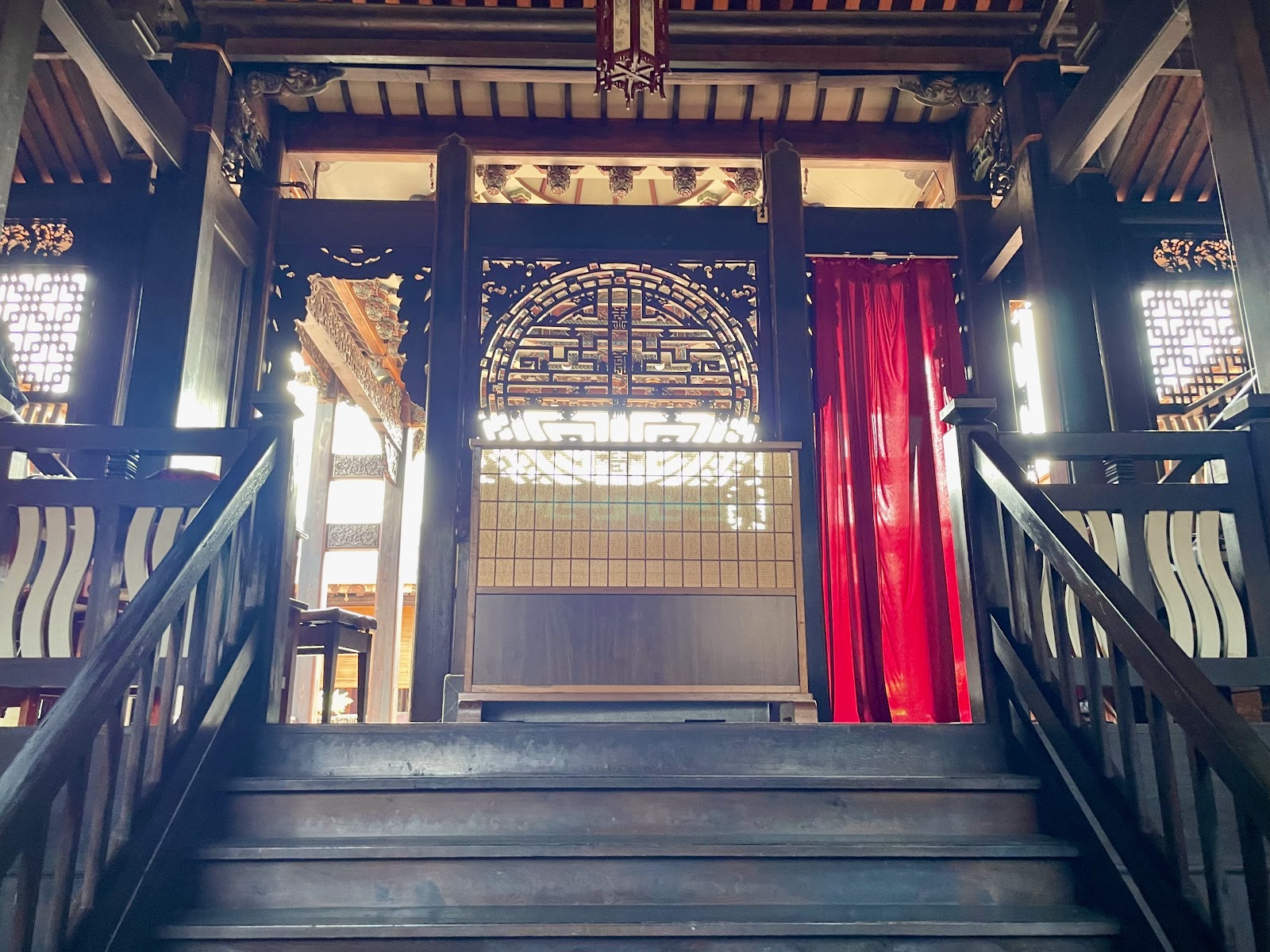 『大花廳』是臺灣唯一“福州式戲臺”架構,步入圓框(外方是矩,內圓是規,一旦進入,其行為就需要合乎規矩,不可逾越)豁然開朗,下方空空的,只有幾座大水缸(是當時的擴音器,利用水的震盪,可以放大聲音,像是立體環繞,名伶就在身邊為你歌唱!)
