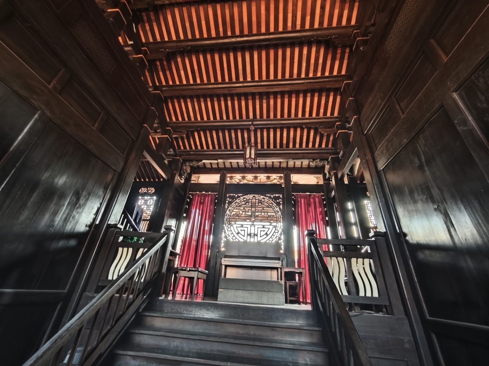 舞台最吸引我的是,戲台最中央上方的八角井頂,超大型“牡丹花”(古代,牡丹是貴族才買得起的花卉,也象徵花開富貴,此處才被取名為「大花廳」)。左側下方隱密的偏房是戲班換妝髮之處,他們從後方樓梯向上,再走往前方的大舞台,進行唱藝和演示。