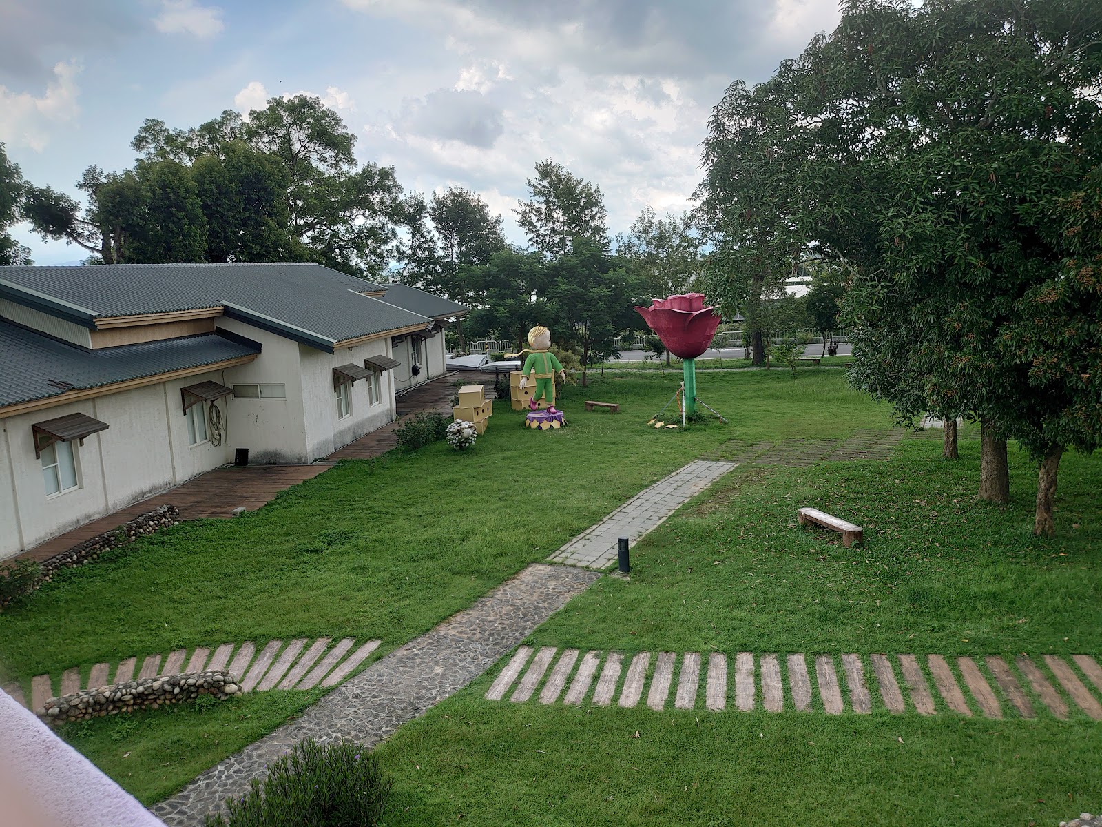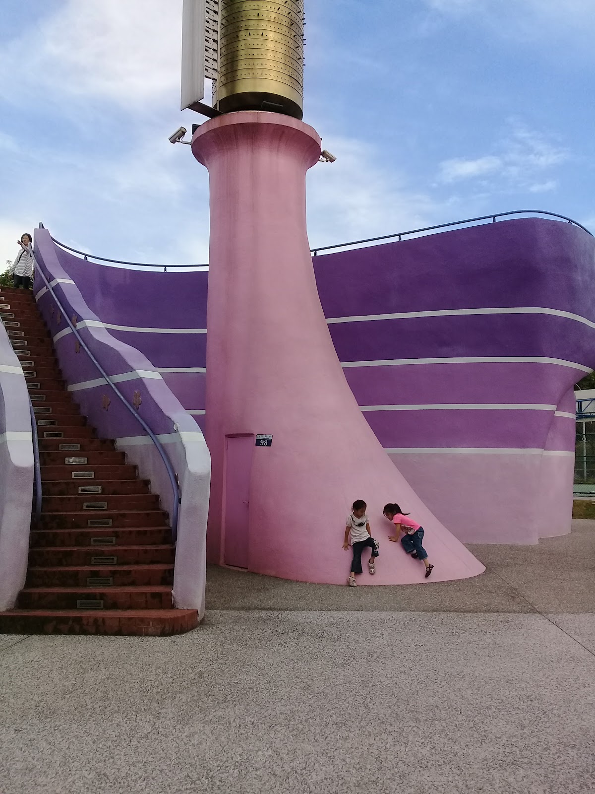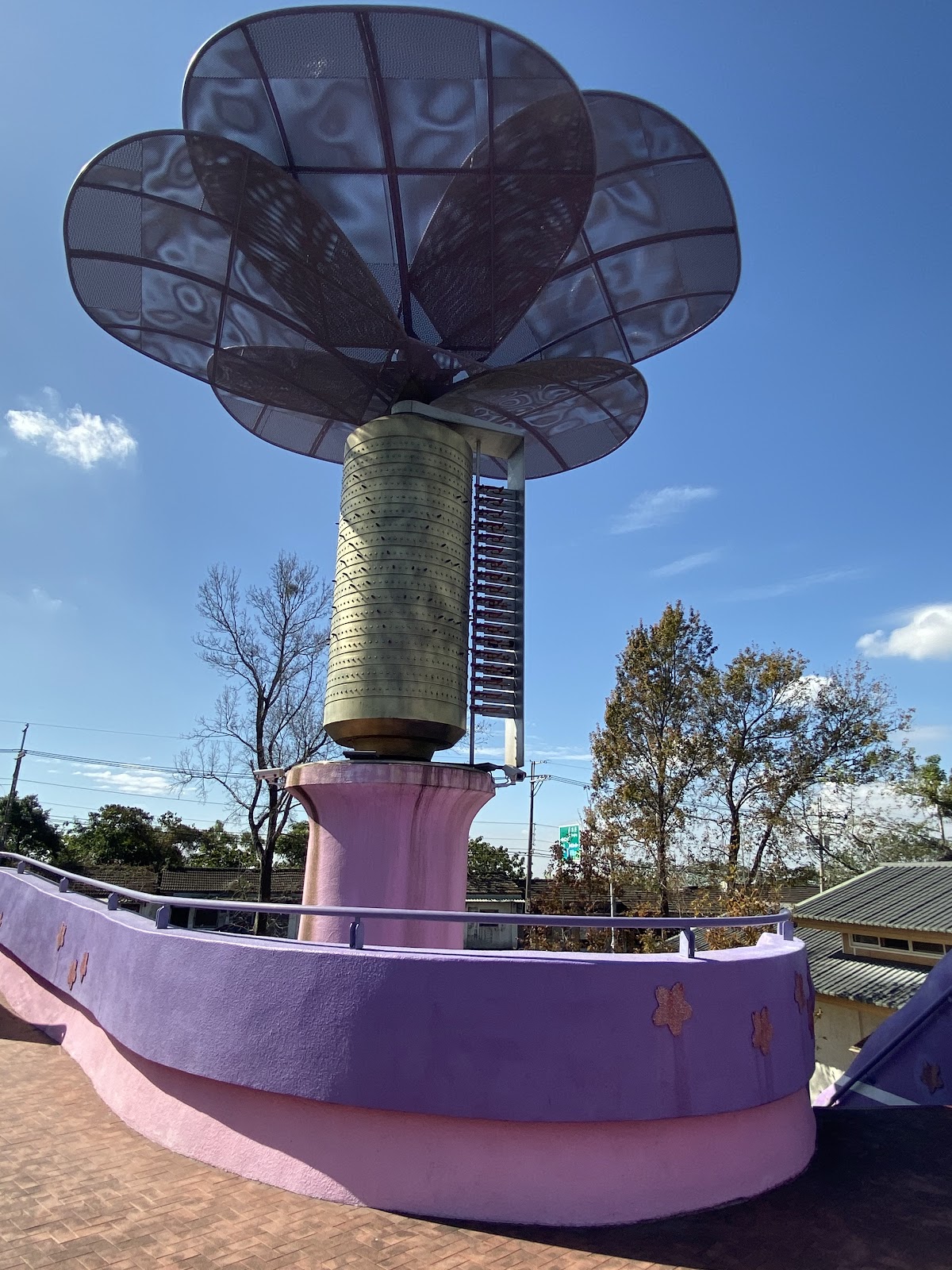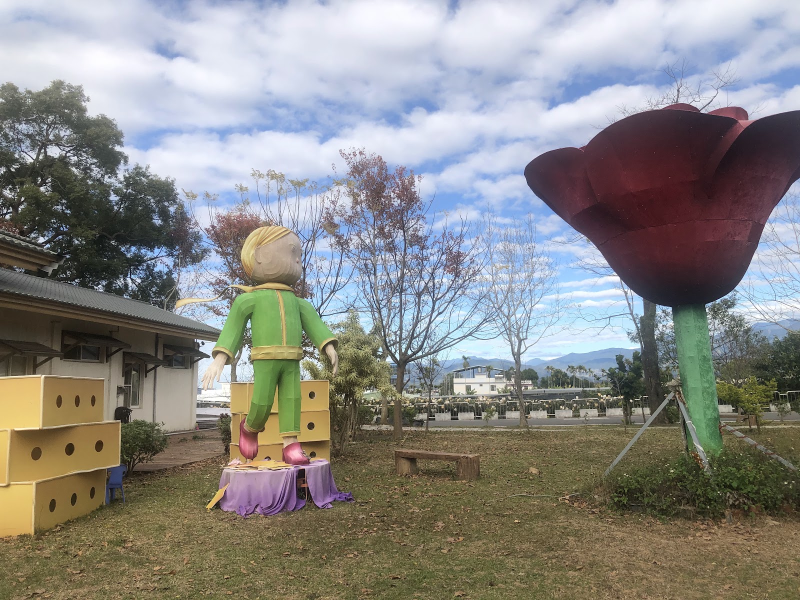 也許是平日,借問站沒開無法幫旅人指點,免費停車場停了九分滿,但遊客卻只有四人?提供的洗手間很乾淨有無障礙設施及停車格。借問站後面是一個小型公園跟籃球場,紫色的星願紫風車建築配上正盛開的藍花楹增添柔美,不知何時可以欣賞星願紫風車的音樂盒樂曲?是寧靜美好的中途休息站。