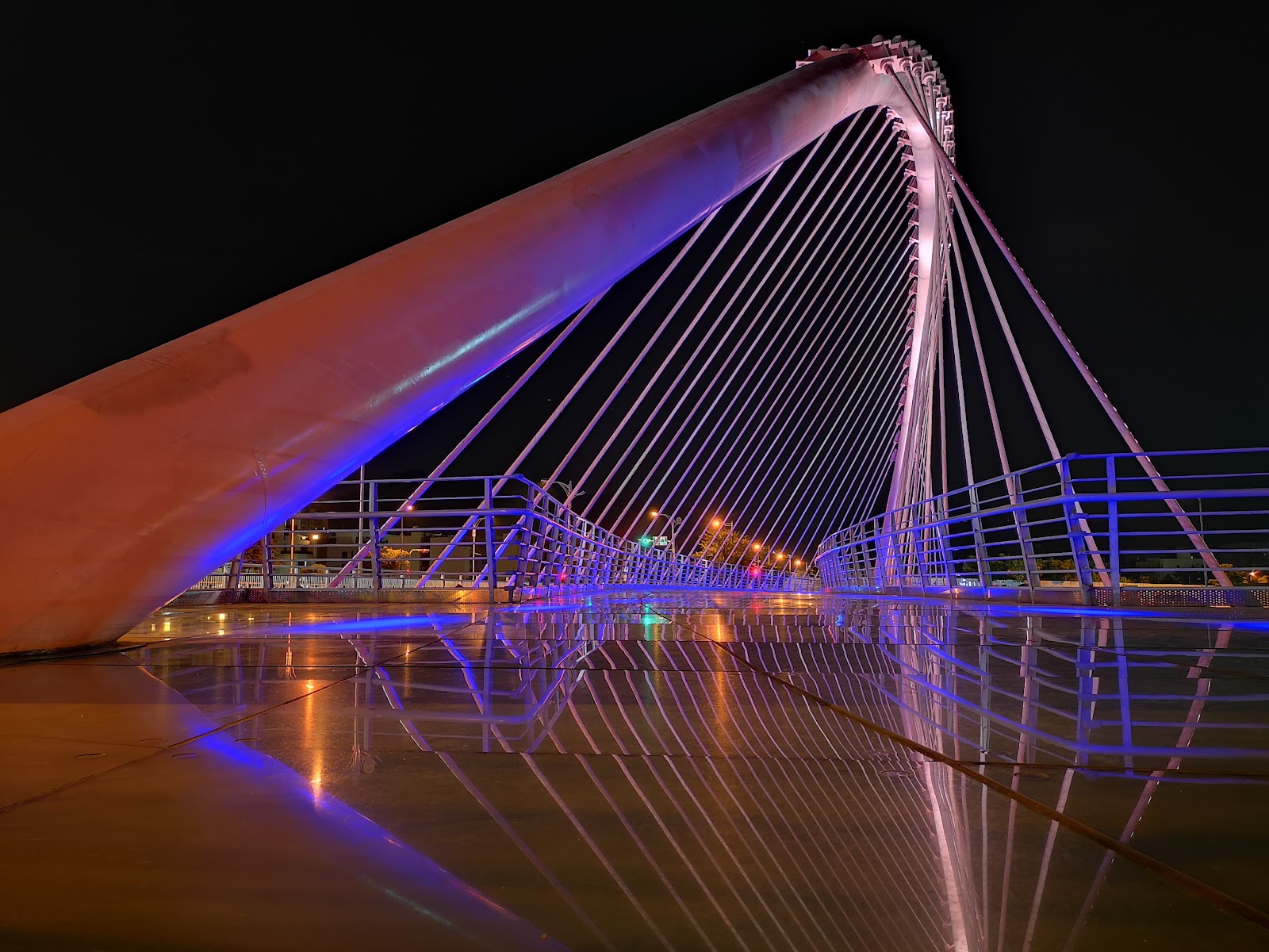 台中大坑情人橋,超唯美的斜張橋,外觀像是座豎琴,整體粉紅色的外觀,給人浪漫、溫暖的感覺,橋面不是冰冷的水泥地,而是能倒映出整座橋面的玻璃材質。