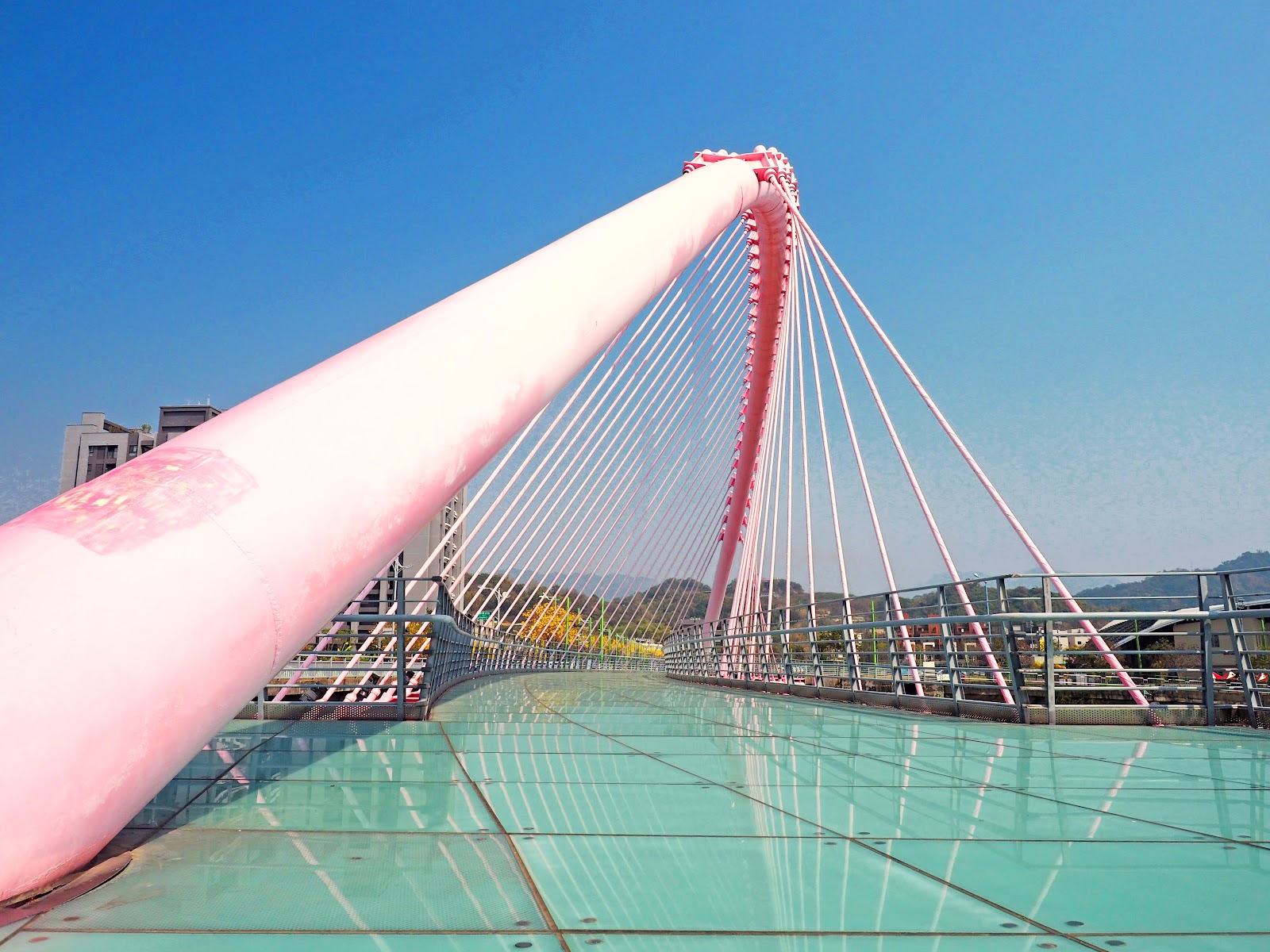 造型很美像粉紅色豎琴一樣,很有特色的一座行人步行專用橋,原本以為玻璃橋面是透明可以看到溪底的,結果不是,懼高的人也可以走得很好不用擔心。