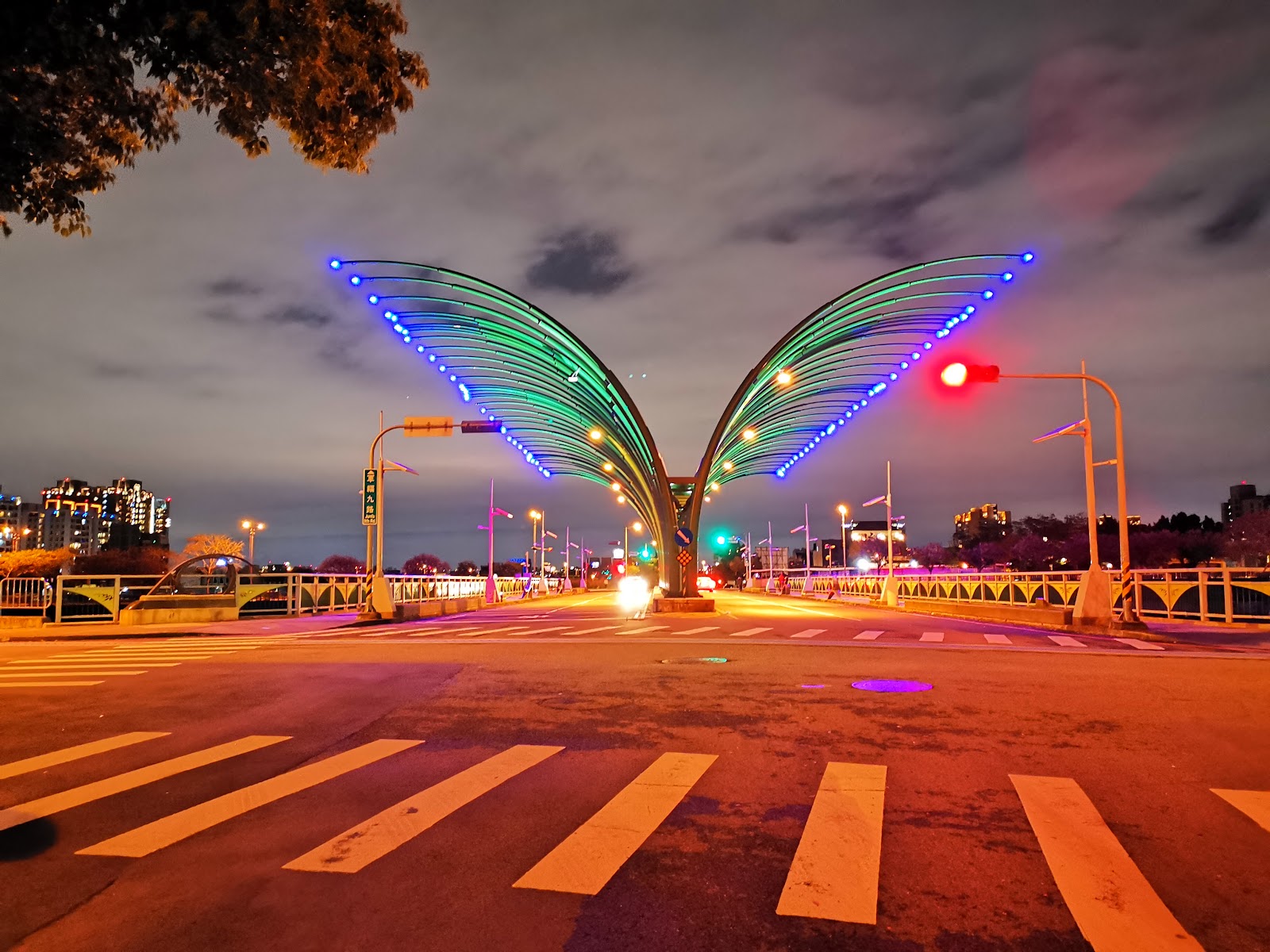 到了夜晚,粉紅的橋身,配上燈光映照,彷彿大大的愛心,擁抱來此夜遊的每對情侶,給予濃濃的祝福