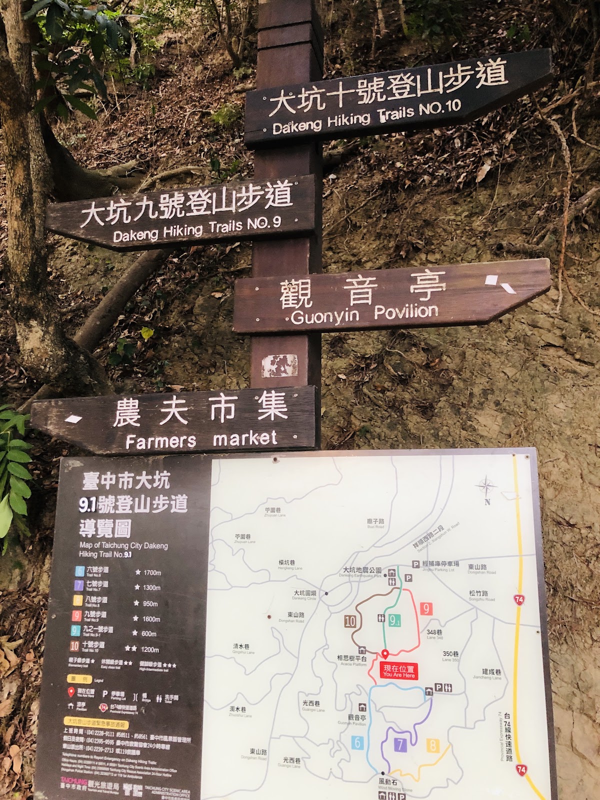 早上與家人約09:00左右一同去大坑步道今天走的是9-1步道回程回來是走9號,原計劃預計走10號,但10號目前是封閉狀態,還在整修中,途中經過很多景點,有觀音亭,還有農夫市集,也拍了一些風景照,早上沒什麼太陽,倒是有風,稍微偏冷,但到了10點多後,太陽終於出來了,暖和許多!在觀音亭短暫休息,曬曬太陽,高點鳥瞰還可看到台中市區,非常優美!,最後下山在農夫市集買了一些菜及熟食,期待下一次目標是6,7,8號及10號步道。