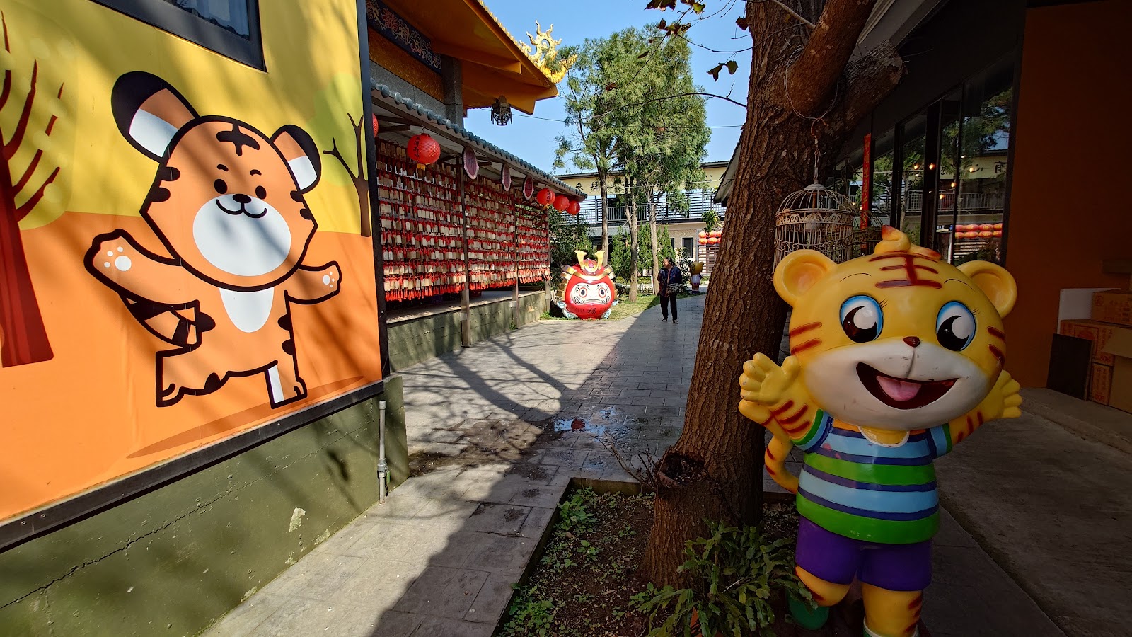 拜拜的同時,也可以去廟旁後方走走,有許多可愛的老虎造型裝置,還可以餵魚~