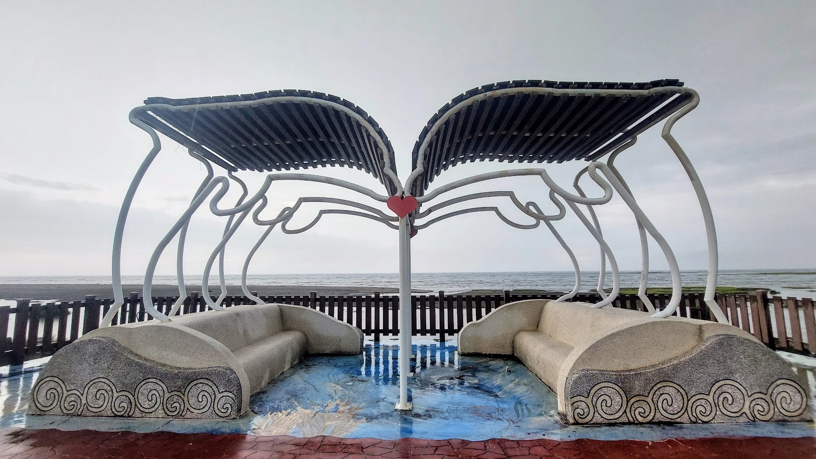 大安濱海海堤很長,可散步,騎自行車。海堤上,像蝴蝶的涼亭,應該在這附近吧。無奈,今天下午,一直飄著雨。