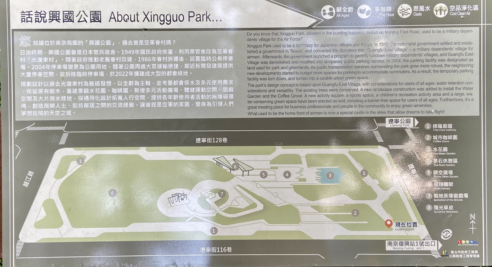 整體來說還是個社區公園,只不過比較大而已,但又沒法大到「城市公園」,但其中的濕地、林道、小丘、流線椅等,顯示是一個花了心思的公園,園中也有簡介資料看板,介紹了這個公園的「故事」,值得推崇,故事延伸人文與感性,其實台北每個社區公園,都有或多或少的故事,寫出來標示起來,讓新生代知道前人的努力!