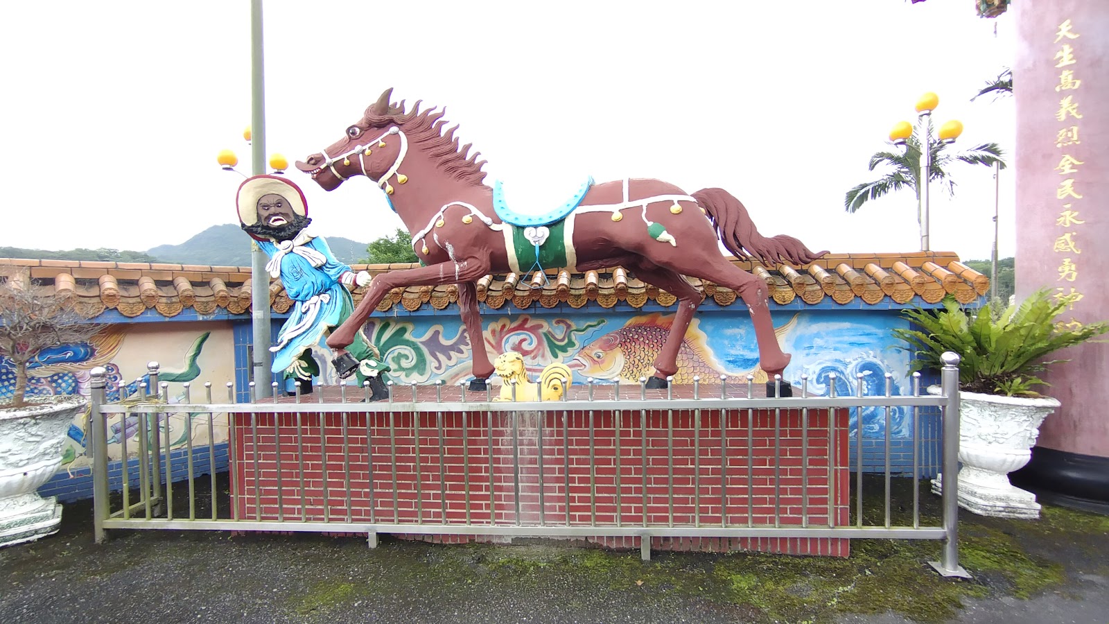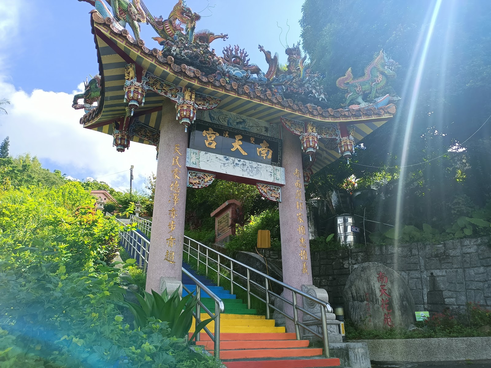從雙溪車站步行過去約10分鐘,位於雙溪車站後站,彩色的階梯步道很鮮豔,主祀關聖帝君,有寬敞的大前庭,視野佳,算是位於相對高點可俯瞰雙溪街區。旁邊的赤兔馬及周倉的雕塑,表情很...有趣(?),南天花苑為昔日的雙溪八景之一,可惜的現今似乎看不到"花苑"的盛況了。